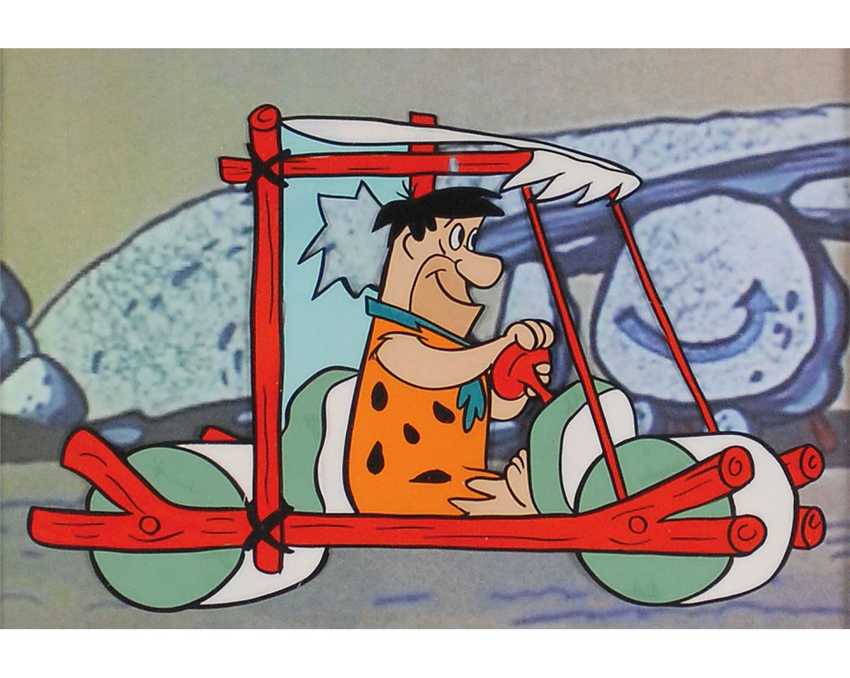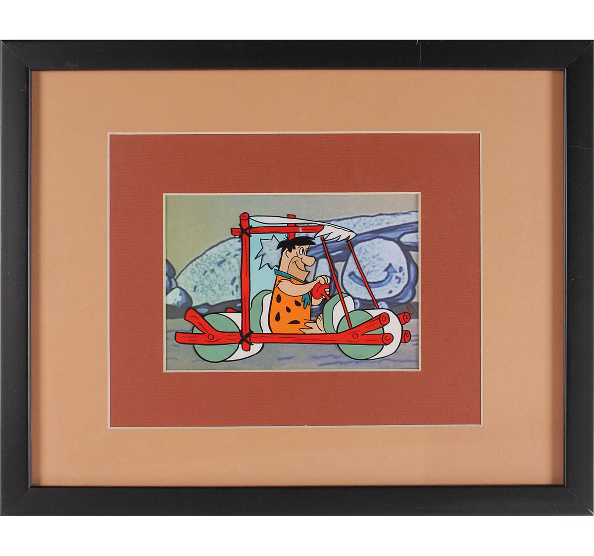 (Hanna-Barbera Studios, 1960) Original production cel featuring Fred Flintstone from The Flintstones, showing him in his famous floorless car from the opening title sequence. The cel is placed on a color copy background. Image measures 6 x 3.75, with a mat opening of 6.5 x 4.5. This piece is also framed to an overall size of 15 x 12. In fine condition, with a couple of hairline cracks to paint.