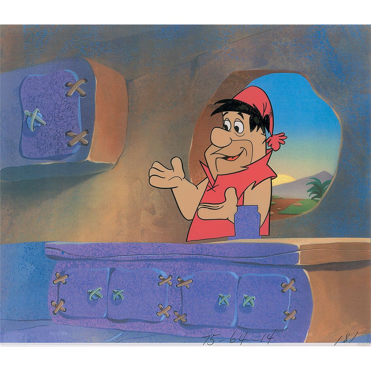 (Hanna-Barbera Studios, 1963) Original production cel featuring Fred Flintstone from Welch’s Grape Juice commercial. The cel is placed on a copy background. Image of Flintstone in his nightcap measures 4.5 x 5, with overall dimensions of 12.75 x 11. In fine condition.