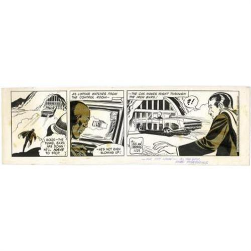 <B>Fred Fredericks - Mandrake Daily Comic Strip Original Art, dated 11-29-67 (King Features Syndicate, 1967).</B></I> This daily has an image area of 17" x 5", and aside from yellowing Zipatone, its condition is Very Good. Signed by Fred Fredericks in the lower border.<BR><BR><b>Shipping:</b> Flat Material, Small (<a target="_blank" href="http://www.heritageauctions.com/common/shipping.php">view shipping information</a>)