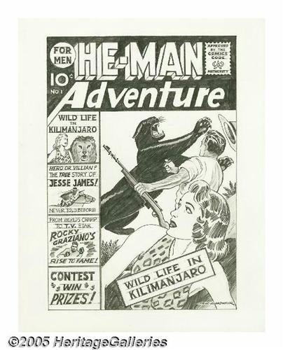 <B>Fred Guardineer - He-Man Adventure #1 Unpublished Preliminary Cover Original Art (undated).</B></I> As the comic book industry continued to evolve at the end of the 1950s, a new trend in publishing began with daring "he-man" adventure magazines featuring war exploits, mountain climbing, hunting, and fishing tales. This tight, preliminary cover layout by Fred Guardineer was most likely slated for a title that, for some reason, was never published. Fred Guardineer outlines the themes of this magazine in a tight, clean, pencil line that even includes a hand-drawn Comics Code Authority stamp! The image area of the piece measures 7.25" x 10.5" and the art is in Excellent condition.