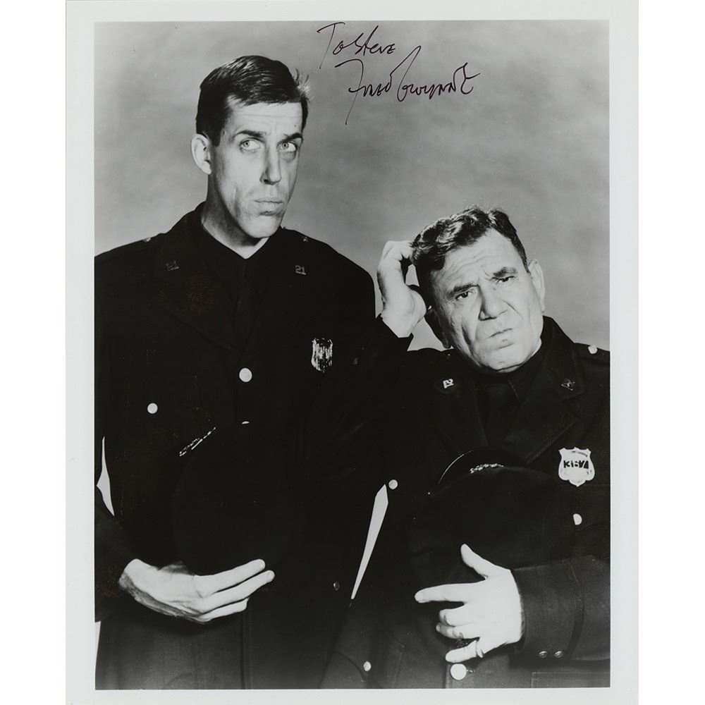 Scarce glossy 8 x 9.75 photo of Fred Gwynne as Francis Muldoon and Joe E. Ross as Gunther Toody from the sitcom Car 54, Where Are You?, signed and inscribed in thin black felt tip, "To Steve, Fred Gwynne.” In fine condition.