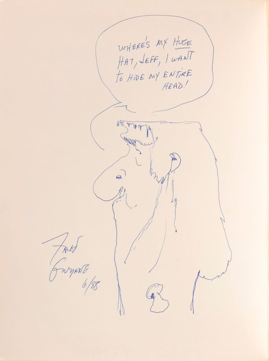 Signed book: A Chocolate Moose for Dinner. NY: Simon & Schuster, 1976. Softcover, 8.25 x 11, 46 pages. Signed on the inside of the front cover in blue ballpoint, “Fred Gwynne, 6/88,” and adding a large sketch of Herman Munster, with the inscription, “Where’s my huge hat, Jeff, I want to hide my entire head!” In fine condition. Consignor notes that the recipient helped with wardrobe for the 1989 film Disorganized Crime. Accompanied by a production daily for the film, and three candid photos from the set, each depicting Gwynne as Max Green. Given the scarcity of Gwynne across all signed formats, sketches, especially of his most recognizable character, are exceedingly uncommon and desirable.