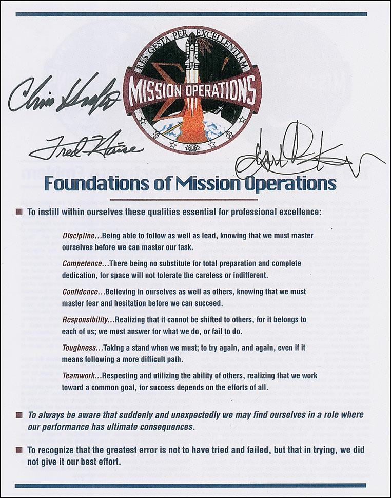 Printed color NASA Foundations of Mission Operations, one page, both sides, 8.5 x 11, signed on the front in black felt tip by Fred Haise, Gene Kranz, and Chris Kraft. In very fine condition.