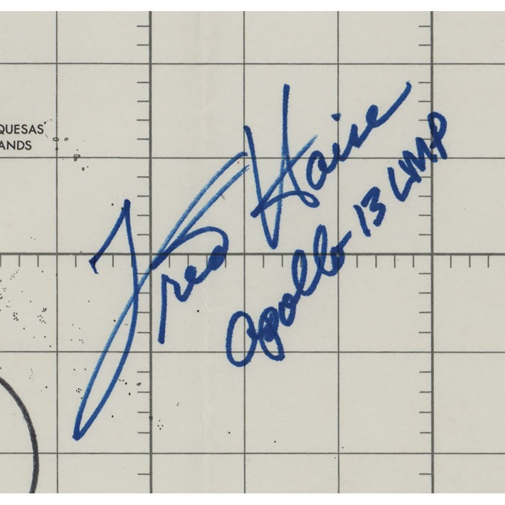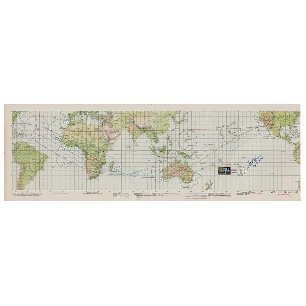 First edition Apollo 13 Earth Orbit Chart, 41.5 x 13.5, prepared for NASA under the direction of the Department of Defense by the Aeronautical Chart and Information Center, dated March 3, 1970, signed in blue felt tip, "Fred Haise, Apollo 13 LMP." The chart outlines the first two orbits around the Earth by the Apollo 13 spacecraft, and is labeled in the lower right, "Apollo Earth Orbit Chart (AEO), Apollo Mission 13, For April 1970 Launch Date." Stamped "Splashdown" at their eventual landing site near the Samoa Islands, and bears an affixed 'First Man on the Moon' stamp canceled at Houston, Texas, on the recovery date of April 17, 1970. Folded and in fine condition.