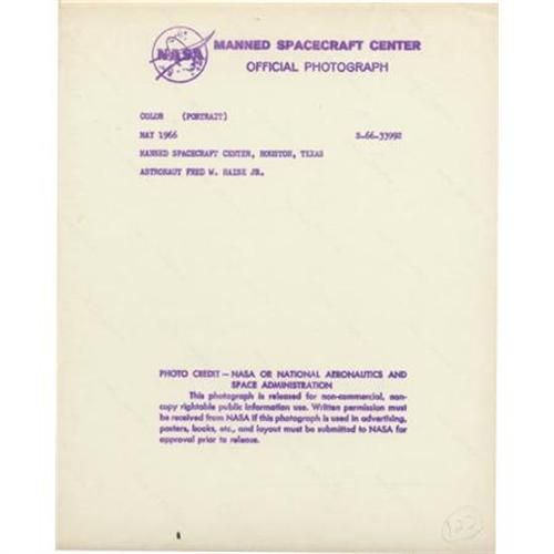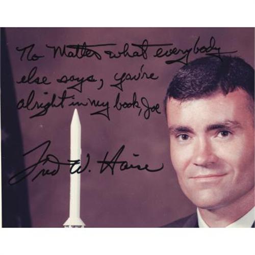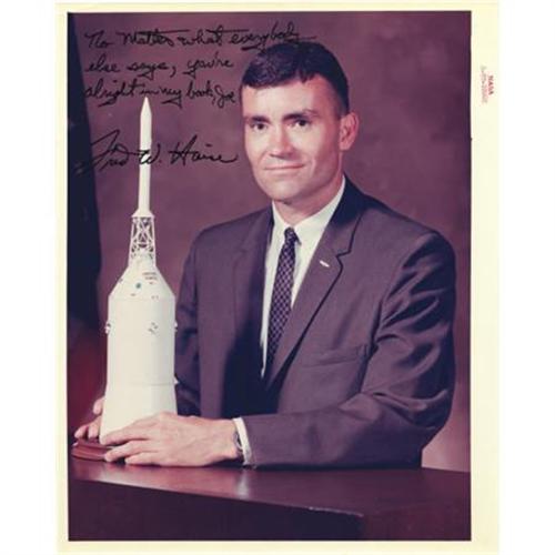 <B>Fred Haise Signed Color Photograph,</B></I> 8" x 10", "<I>No Matter what everybody/ else says, you're/ alright in my book, Joe/ Fred W. Haise</B></I>." Haise was Lunar Module pilot on Apollo 13 (1970). The mission was aborted due to an explosion aboard the command module. <I>From the collection of renowned former physical trainer of the astronauts Joe Garino. This lot is accompanied by a signed certificate of authentication from Garino verifying its provenance.</B></I><BR><BR><b>Shipping:</b> Flat Material, Small (<a target="_blank" href="http://www.heritageauctions.com/common/shipping.php">view shipping information</a>)