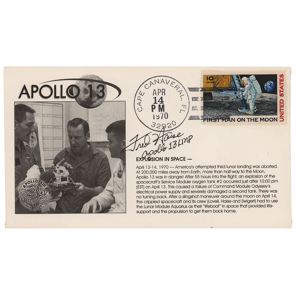 Commemorative cover with a cachet honoring Apollo 13 and featuring a description of the explosion in space, postmarked at Cape Canaveral on April 14, 1970, signed in black felt tip, "Fred Haise, Apollo 13 LMP." In very fine condition.