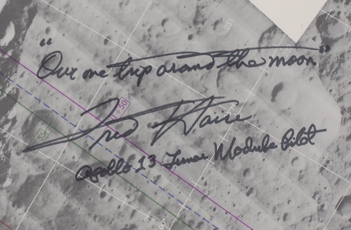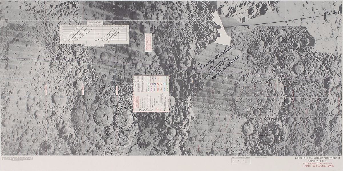 Excellent color 43 x 21.25 Lunar Orbit Science Flight chart for the Apollo 13 mission, signed in black felt tip, “‘Our one trip around the moon,’ Fred Haise, Apollo 13 Lunar Module Pilot.” Labeled in the lower right corner, “Chart A, 1 of 4, Apollo mission 13, REV 1 through 18, 11 April 1970 Launch Date,” this first edition chart, dated February 2, 1970, shows the rough lunar terrain with various points of interest and planned tracking lines for Apollo 13 lunar orbits. Rolled and in fine condition. Though dozens of lunar orbits were planned, Apollo 13 only got to go around the moon once because of their emergency return after the oxygen tank explosion, rendering Haise’s inscription on this piece quite fitting.