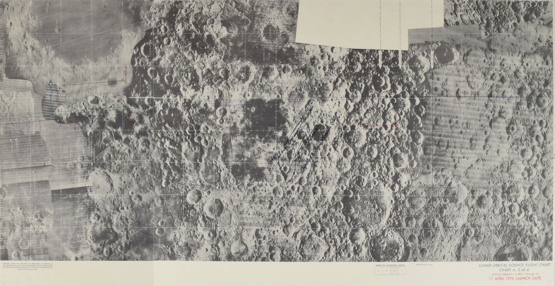 Official Apollo 13 Lunar Orbital Science Flight Chart, 43 x 21.5, signed in black felt tip, "'Our one trip around the moon,' Fred Haise, Apollo 13 Lunar Module Pilot." Labeled in the lower right corner, "Chart A, 2 of 4, Apollo Mission 13, REV 1 through 18, 11 April 1970, Launch Date," this chart displays the harsh lunar terrain and the planned tracking lines for several Apollo 13 lunar orbits. Ultimately Apollo 13 made only one lunar orbit, using the moon’s own gravity to sling the damaged spacecraft back to Earth. Rolled and in very good to fine condition, with creasing to the sides.