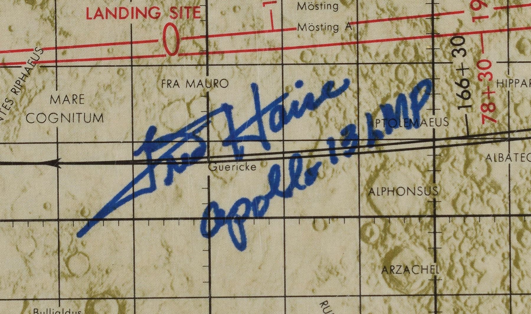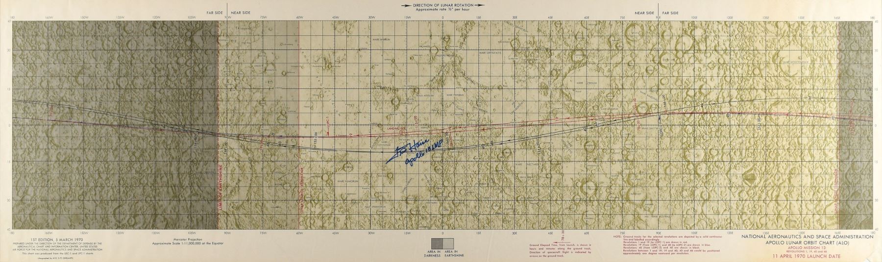 Appealing color first edition Apollo 13 Lunar Orbit Chart for revolutions 1, 19, 40, and 46, measures 41 x 12, dated March 5, 1970, signed near the planned Fra Mauro landing site in blue felt tip, "Fred Haise, Apollo 13 LMP." Lithographed by ACIC 3-70, and prepared under the direction of the Department of Defense by the Aeronautical Chart and Information Center. Rolled and in fine condition.
