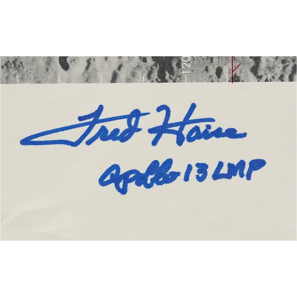 First edition Apollo 13 Lunar Orbital Science Flight Chart, 43 x 23.5, signed in the lower border in blue felt tip, "Fred Haise, Apollo 13 LMP." Labeled in the lower right corner, "Chart C, 2 of 4, Apollo Mission 13, REV 40 through 46, 11 April 1970, Launch Date," this chart displays the harsh lunar terrain and the planned tracking lines for several Apollo 13 lunar orbits. Ultimately Apollo 13 made only one lunar orbit, using the moon‰Ûªs own gravity to sling the damaged spacecraft back to Earth. Folded and in fine condition, with light wrinkling to edges. In fine condition.