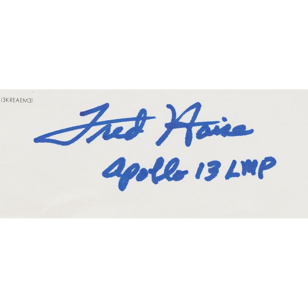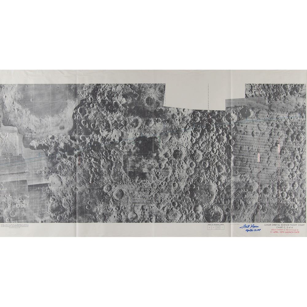 First edition Apollo 13 Lunar Orbital Science Flight Chart, 43 x 23.5, signed in the lower border in blue felt tip, "Fred Haise, Apollo 13 LMP." Labeled in the lower right corner, "Chart C, 2 of 4, Apollo Mission 13, REV 40 through 46, 11 April 1970 Launch Date," this chart displays the harsh lunar terrain and the planned tracking lines for several Apollo 13 lunar orbits. Ultimately Apollo 13 made only one lunar orbit, using the moon’s own gravity to sling the damaged spacecraft back to Earth. Folded and in fine condition, with light wrinkling to edges.