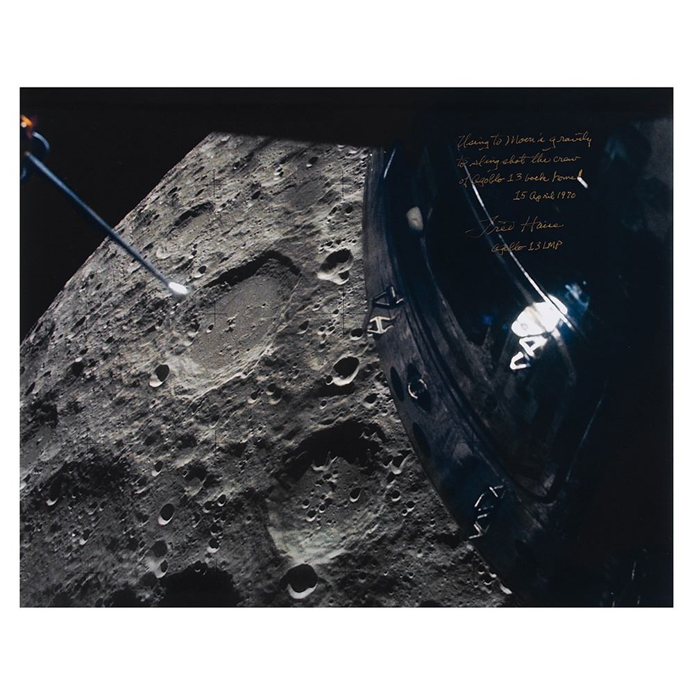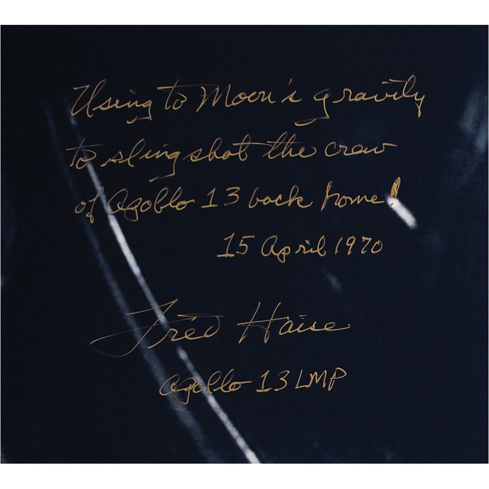 Color glossy 20 x 16 photo of the densely cratered surface of the moon as viewed from the cabin of the Apollo 13 spacecraft, signed in gold ink, "Using the Moon's gravity to sling shot the crew of Apollo 13 back home! 15 April 1970, Fred Haise, Apollo 13 LMP." In fine condition.
