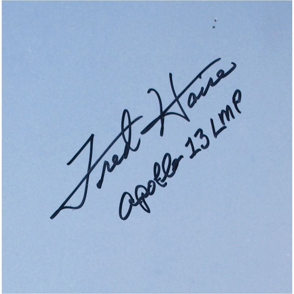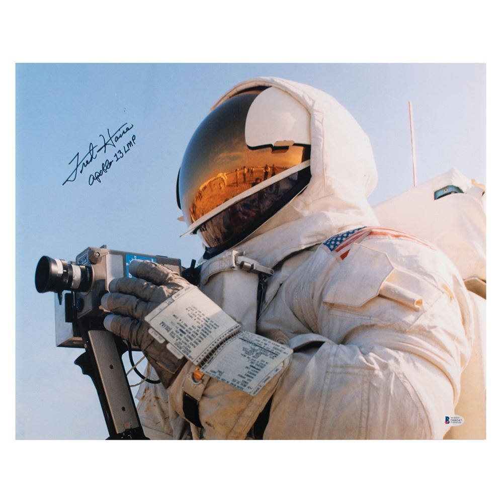 Color satin-finish 20 x 16 photo of Haise using the RCU-mounted Data Acquisition Camera (DAC) during an EVA training, signed in black felt tip, "Fred Haise, Apollo 13 LMP." In fine condition, with a Beckett label affixed to the lower corner. Accompanied by a certificate of authenticity from Beckett.
