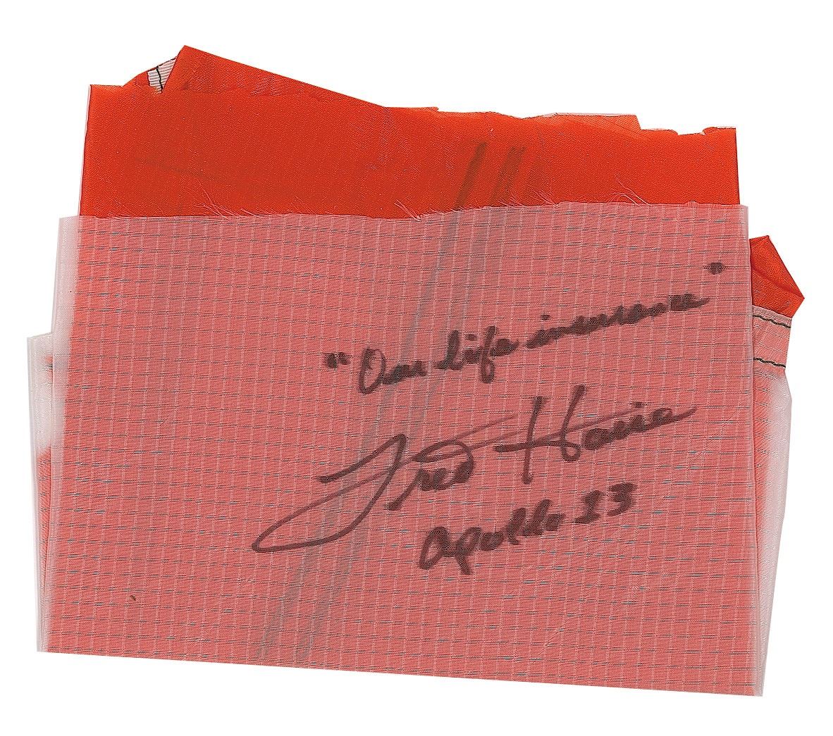 Large two-layer swatch of Apollo program parachute fabric, approximately 21 x 10, signed in black felt tip, "'Our life insurance,' Fred Haise, Apollo 13." In fine condition.