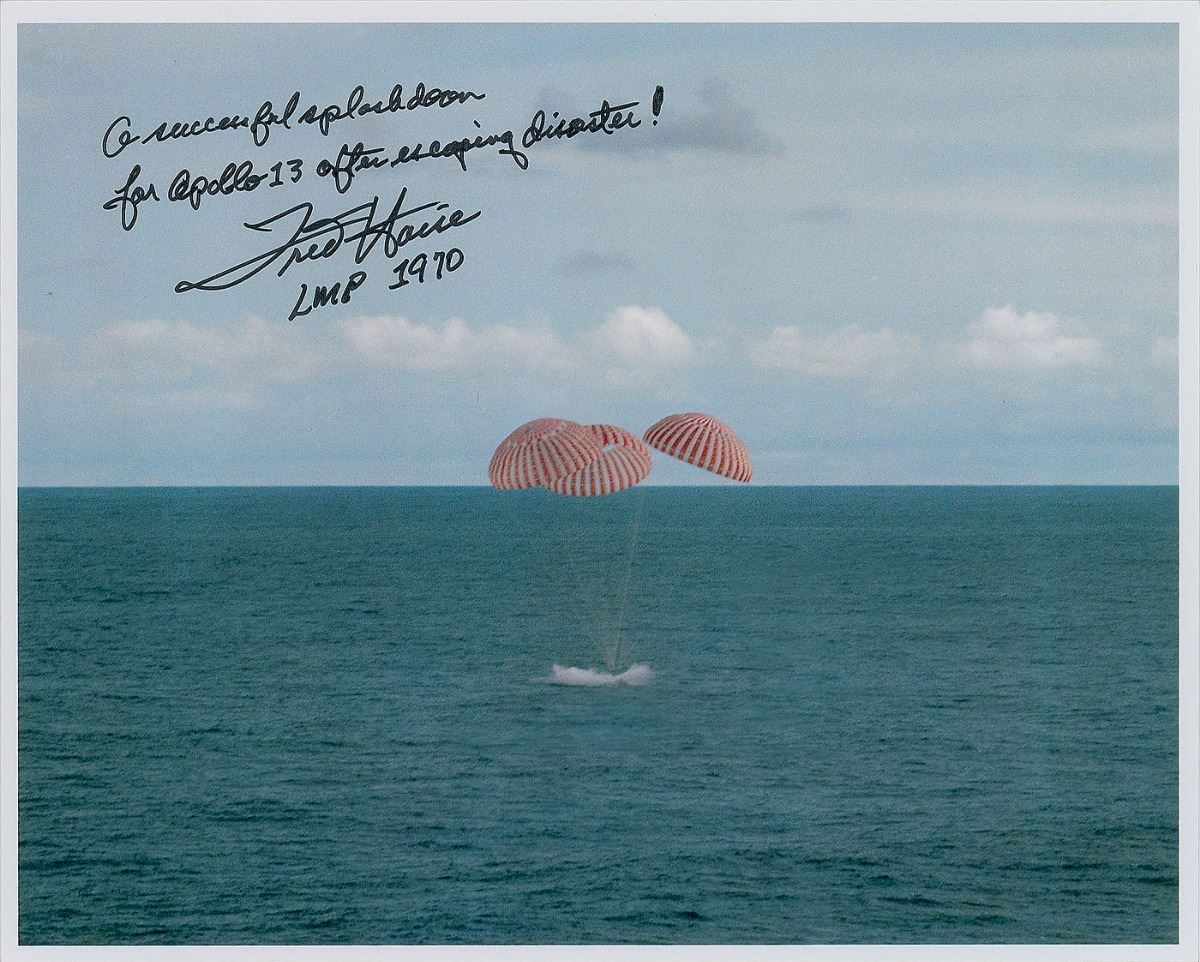 Dramatic color satin-finish 10 x 8 photo of the Apollo 13 splashdown on April 17, 1970, signed in black felt tip, “A successful splashdown for Apollo 13 after escaping disaster! Fred Haise, LMP 1970.” In fine condition.