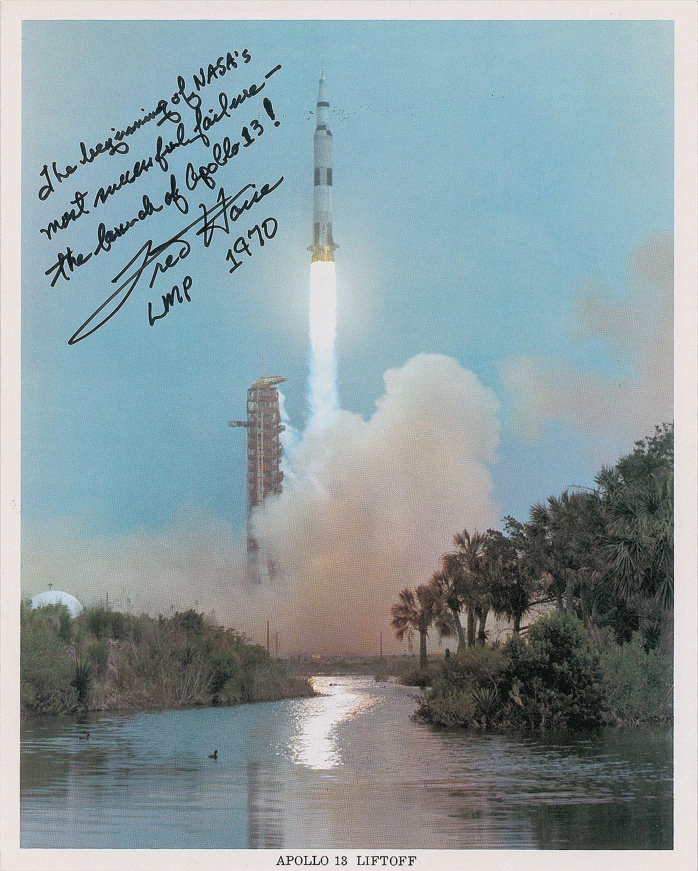 Official color 8 x 10 NASA lithograph of the Apollo 13 liftoff on April 11, 1970, signed in black felt tip, "The beginning of NASA's most successful failure—the launch of Apollo 13! Fred Haise, LMP, 1970." In fine condition, with some stray ink spots near spacecraft.