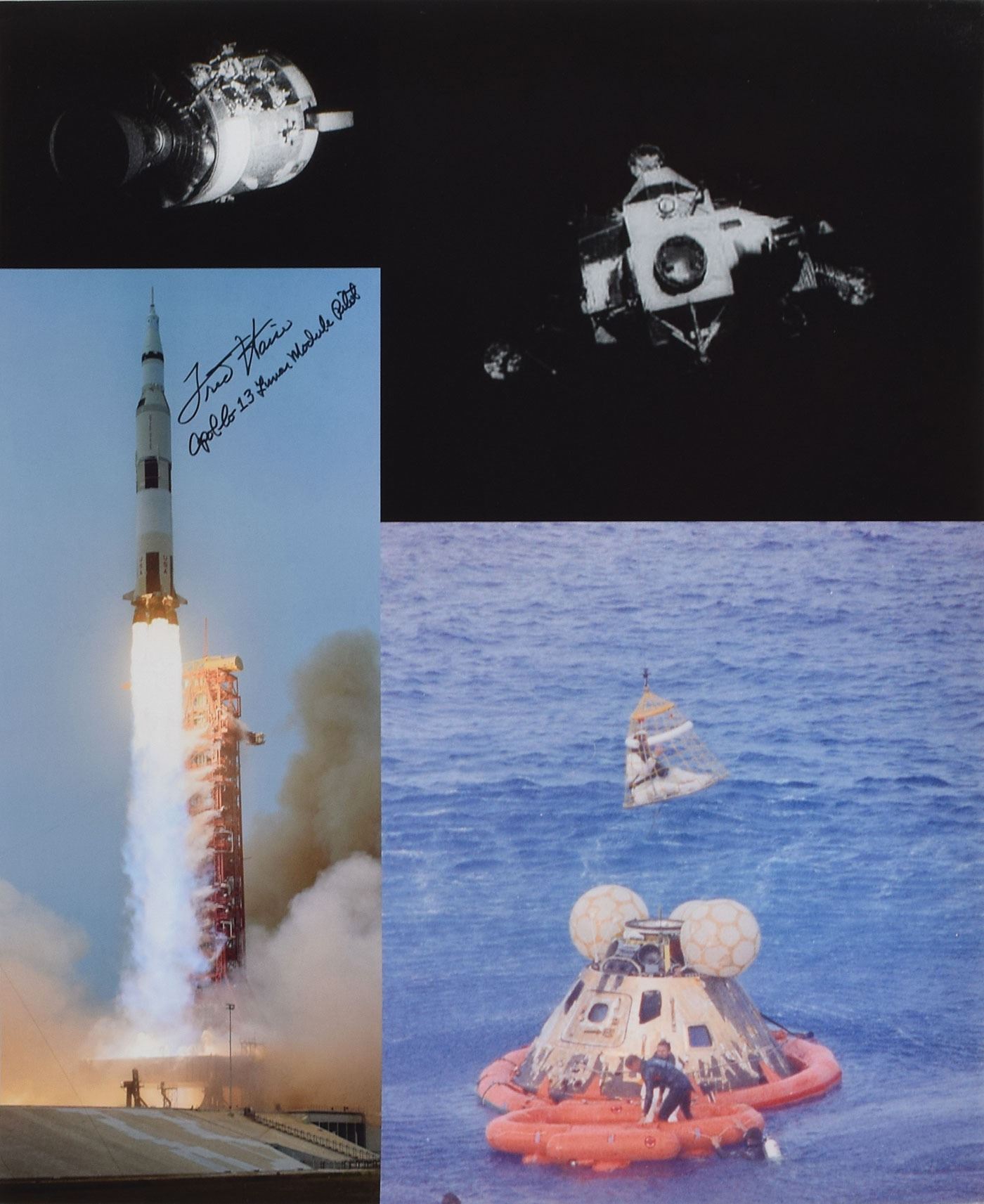 Interesting color satin-finish 16 x 20 composite photo chronicling Apollo 13 from liftoff to splashdown, signed in black felt tip, "Fred Haise, Apollo 13 Lunar Module Pilot." In fine condition.
