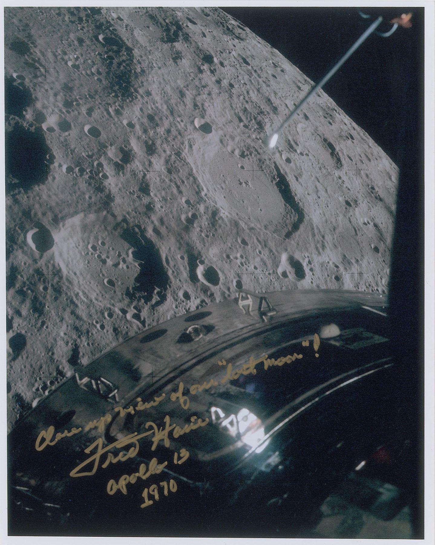 Color satin-finish 8 x 10 close-up photo of the cratered lunar surface, signed in gold ink, "Close up of our 'lost moon'! Fred Haise, Apollo 13, 1970." In very fine condition.