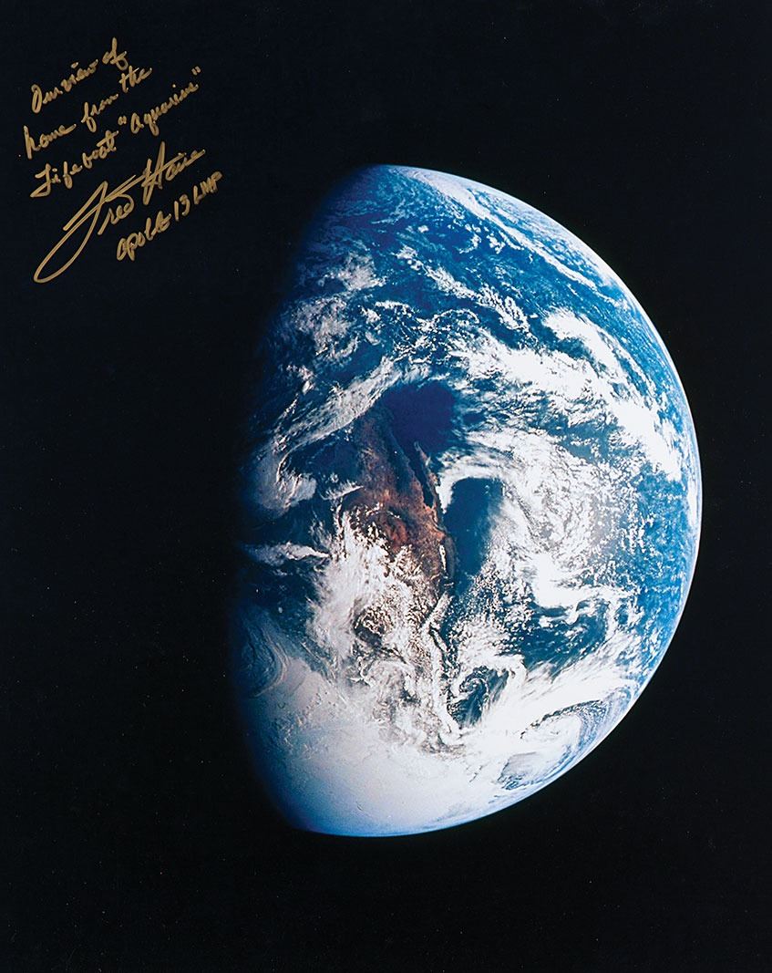 Gorgeous color satin-finish 16 x 20 photo of planet Earth, signed in gold ink, “Our view of home from the Lifeboat ‘Aquarius,’ Fred Haise, Apollo 13 LMP.” In fine condition.