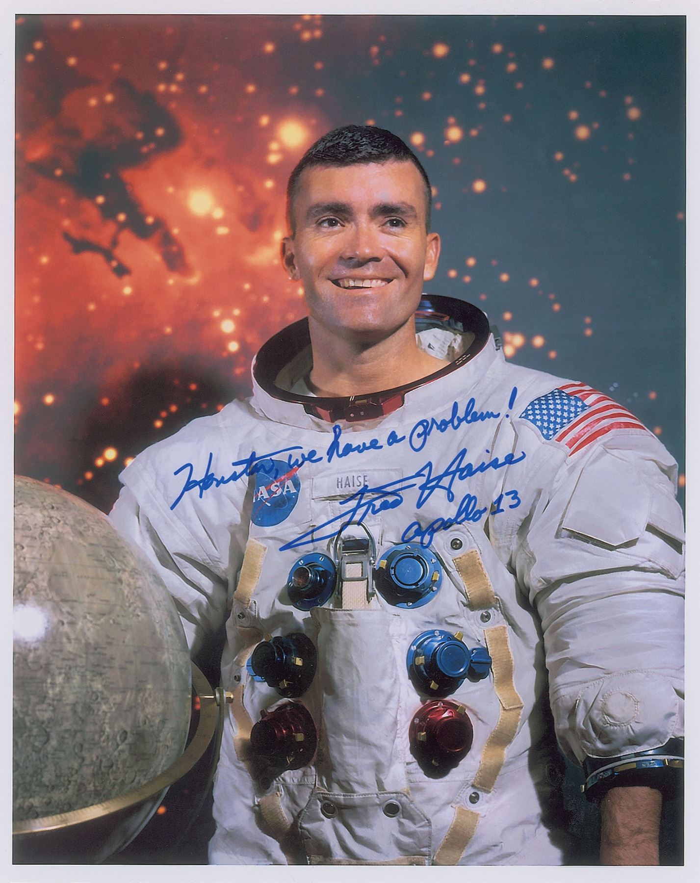 Color satin-finish 8 x 10 photo of the Apollo 13 LMP posing in his white space with a lunar globe, signed in blue felt tip, "Houston, we have a problem! Fred Haise, Apollo 13." In very fine condition.