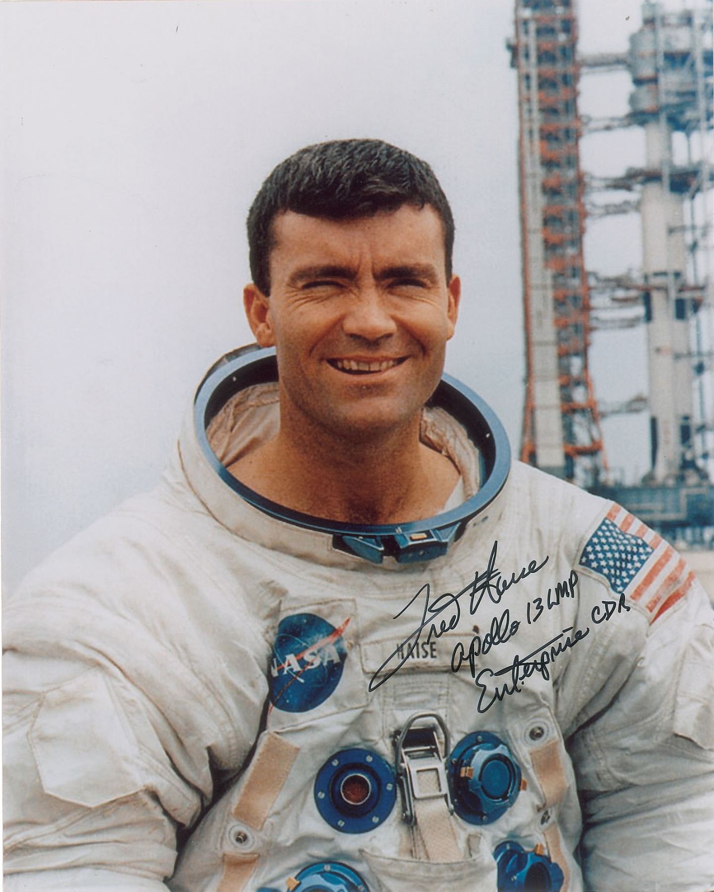 Color semi-glossy 8 x 10 photo of Haise posing outside in his white space suit with a Saturn rocket looming in the background, signed in black felt tip, "Fred Haise, Apollo 13 LMP, Enterprise CDR." Reverse bears an affixed label from the Astronaut Scholarship Foundation certifying that the autograph was signed for the organization. In very fine condition.