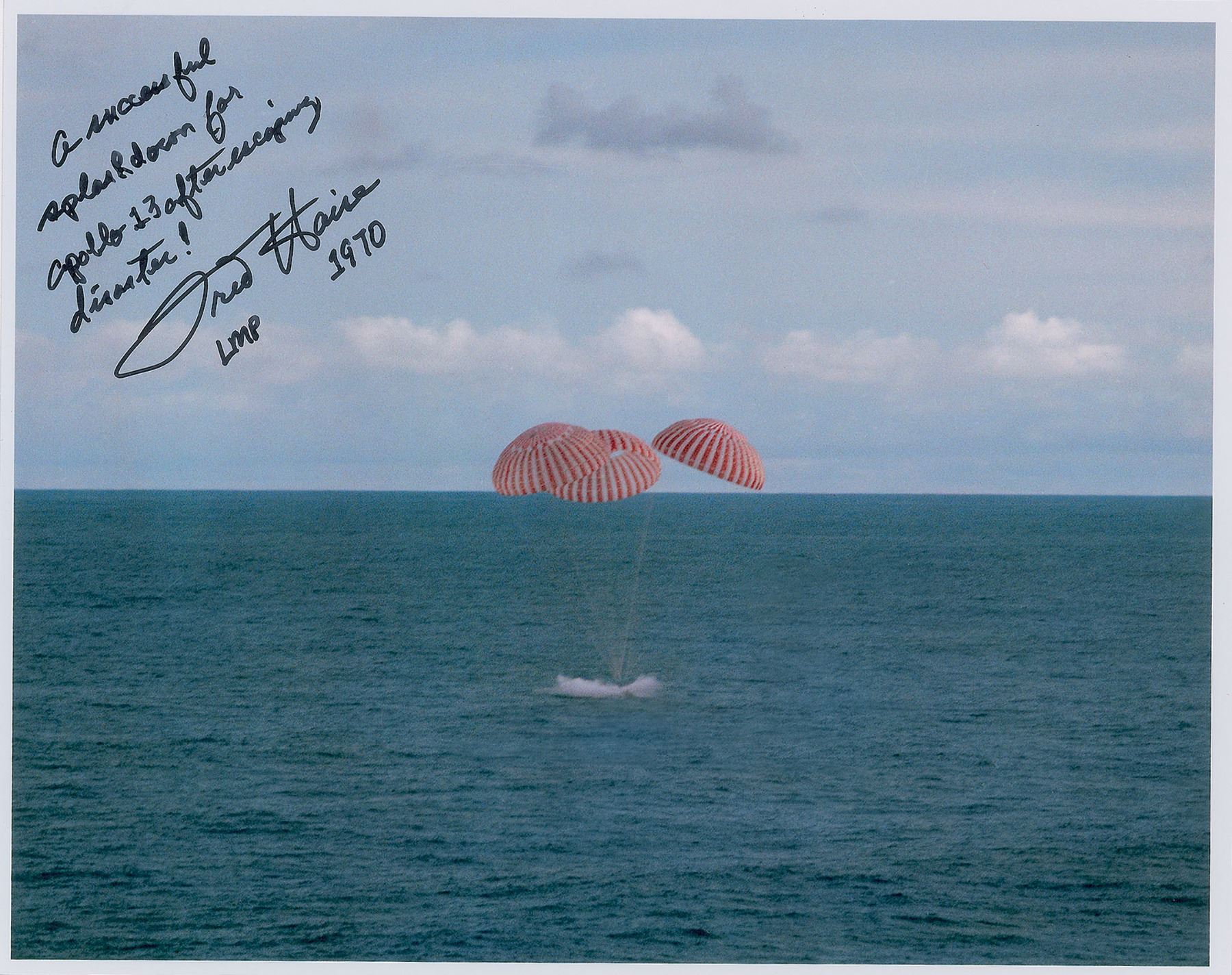 Color satin-finish 10 x 8 photo of the Apollo 13 splashdown, signed in black felt tip, "'A successful splashdown for Apollo 13 after escaping disaster!' Fred Haise, LMP 1970." In very fine condition.
