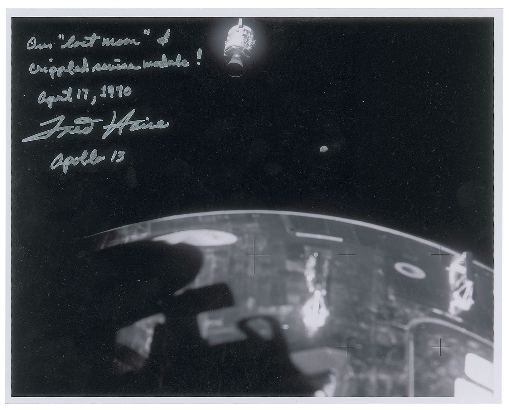 Satin-finish 10 x 8 photo of the Apollo 13 CSM and moon as seen from the LM 'lifeboat,' signed in silver ink, "Our 'lost moon' & crippled service module! April 17, 1970, Fred Haise, Apollo 13." In very fine condition.