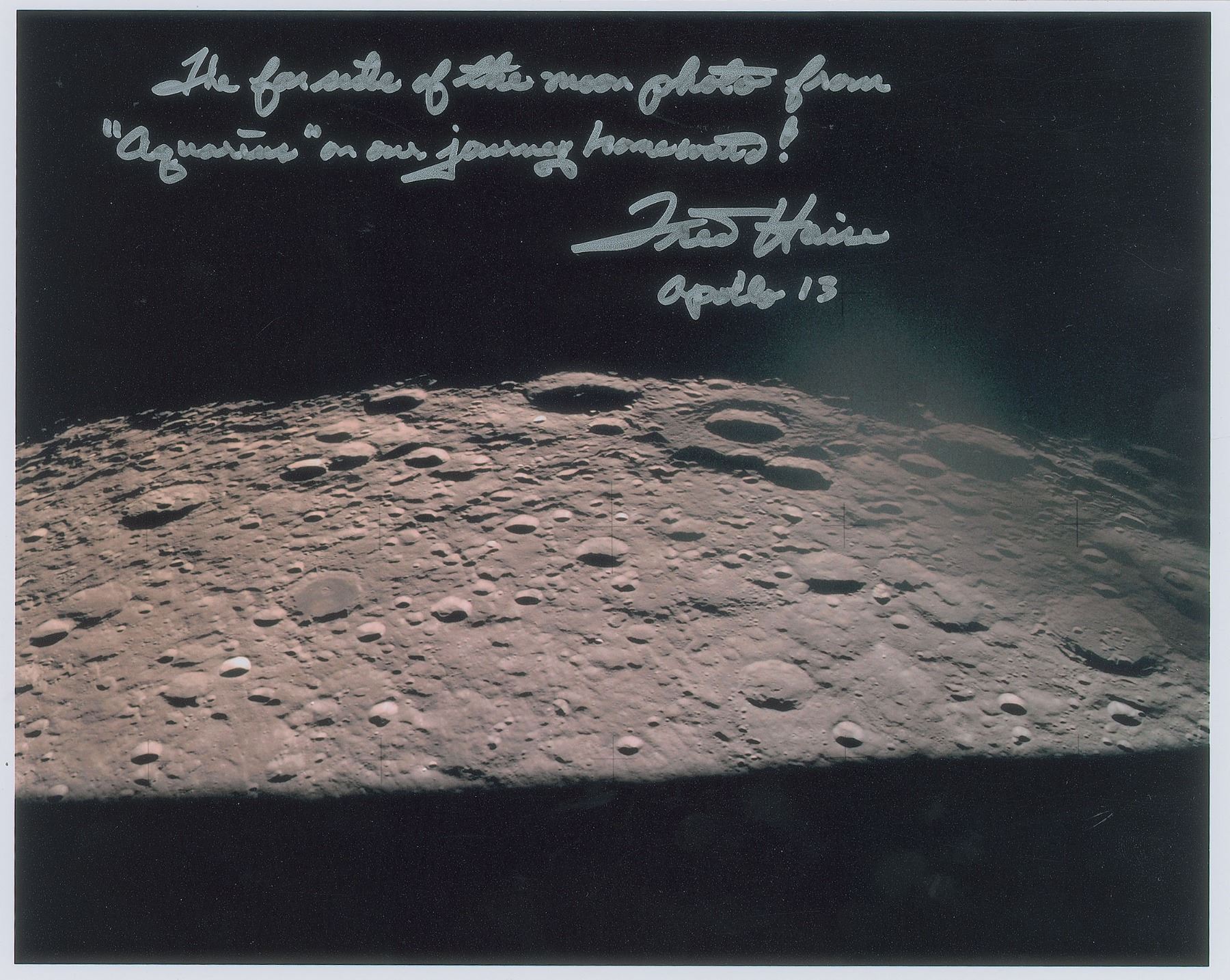 Color satin-finish 10 x 8 photo of the cratered lunar surface, signed in silver ink, "The far side of the moon photo from 'Aquarius' on our journey homeward! Fred Haise, Apollo 13." In very fine condition.