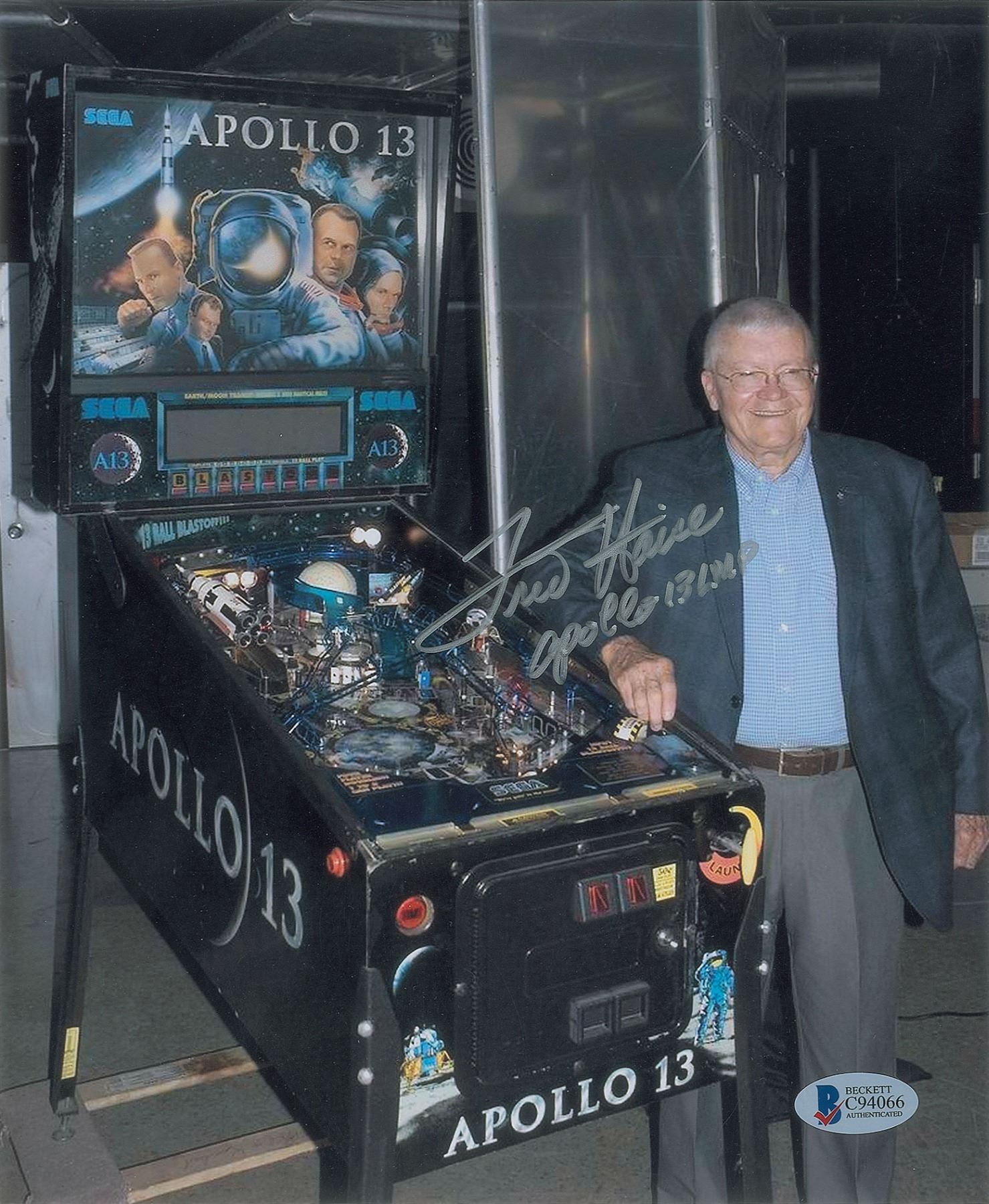 Color satin-finish 8 x 10 photo of Haise posing beside a pinball machine for the Oscar-winning movie Apollo 13, signed in silver ink, "Fred Haise, Apollo 13 LMP." In fine condition, with a Beckett label affixed to the lower right corner (certificate of authenticity not present).