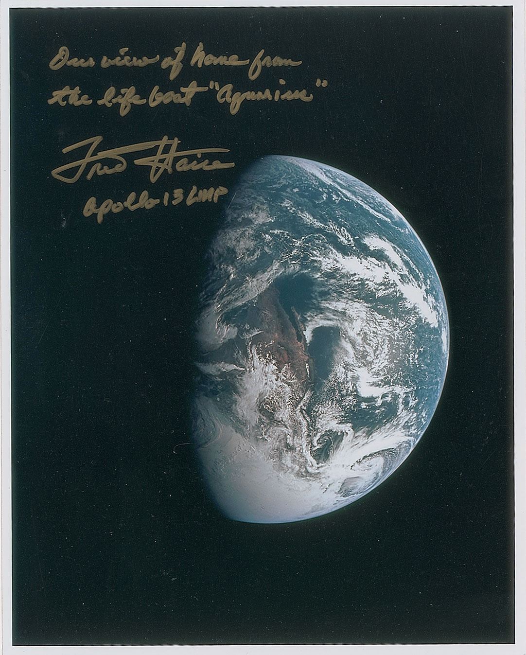 Color satin-finish 8 x 10 photo of a view from Earth taken on Apollo 13, signed in gold ink, "Our view of home from the lifeboat 'Aquarius!' Fred Haise, Apollo 13 LMP." In very fine condition.