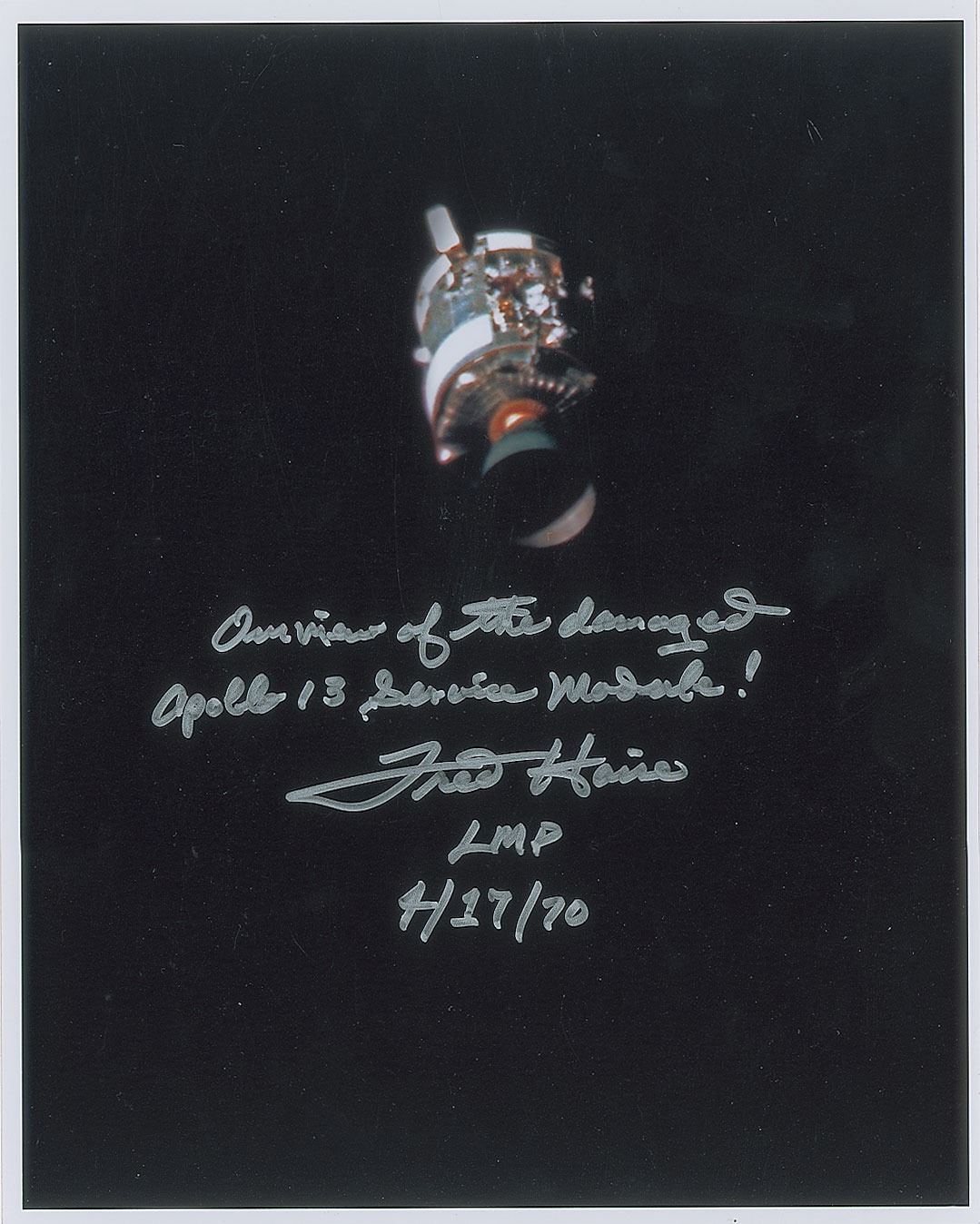 Color satin-finish 8 x 10 photo of the crippled Apollo 13 service module floating in space, signed in silver ink, "Our view of the damaged Apollo 13 Service Module! Fred Haise, LMP, 4/17/70." In very fine condition.