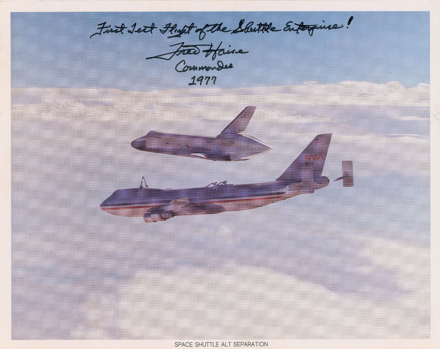 Official color 10 x 8 NASA lithograph of the Space Shuttle ALT separation, signed in black felt tip, "First test flight of the Shuttle Enterprise! Fred Haise, Commander, 1977." In fine condition.
