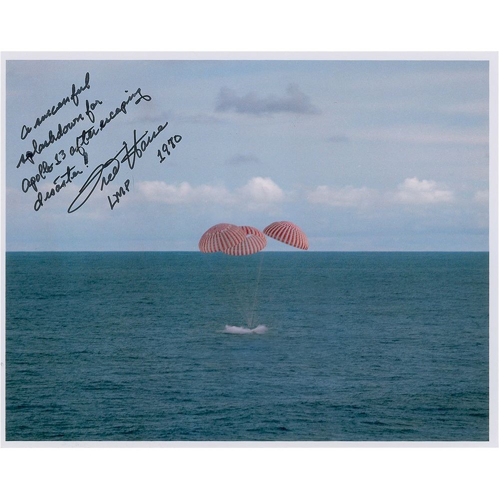 Color satin-finish 10 x 8 photo of the Apollo 13 splashdown, signed in black felt tip, "'A successful splashdown for Apollo 13 after escaping disaster!' Fred Haise, LMP 1970." In very fine condition.