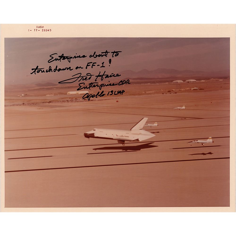 Official color semi-glossy 10 x 8 red-numbered NASA photo (S-77-28540) of the prototype Space Shuttle Enterprise preparing to land Free flight #1 as part of the ALT-12 mission, signed in black felt tip, "Enterprise about to touchdown on FF-1! Fred Haise, Enterprise CDR, Apollo 13 LMP." Reverse bears "This Paper Manufactured by Kodak" watermarks. In very fine condition.