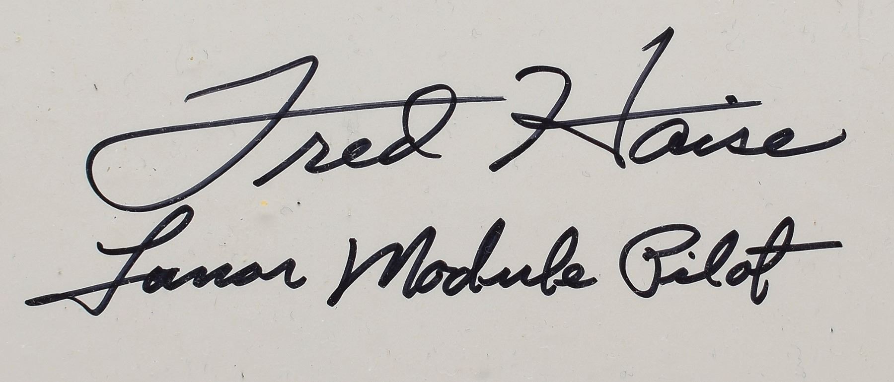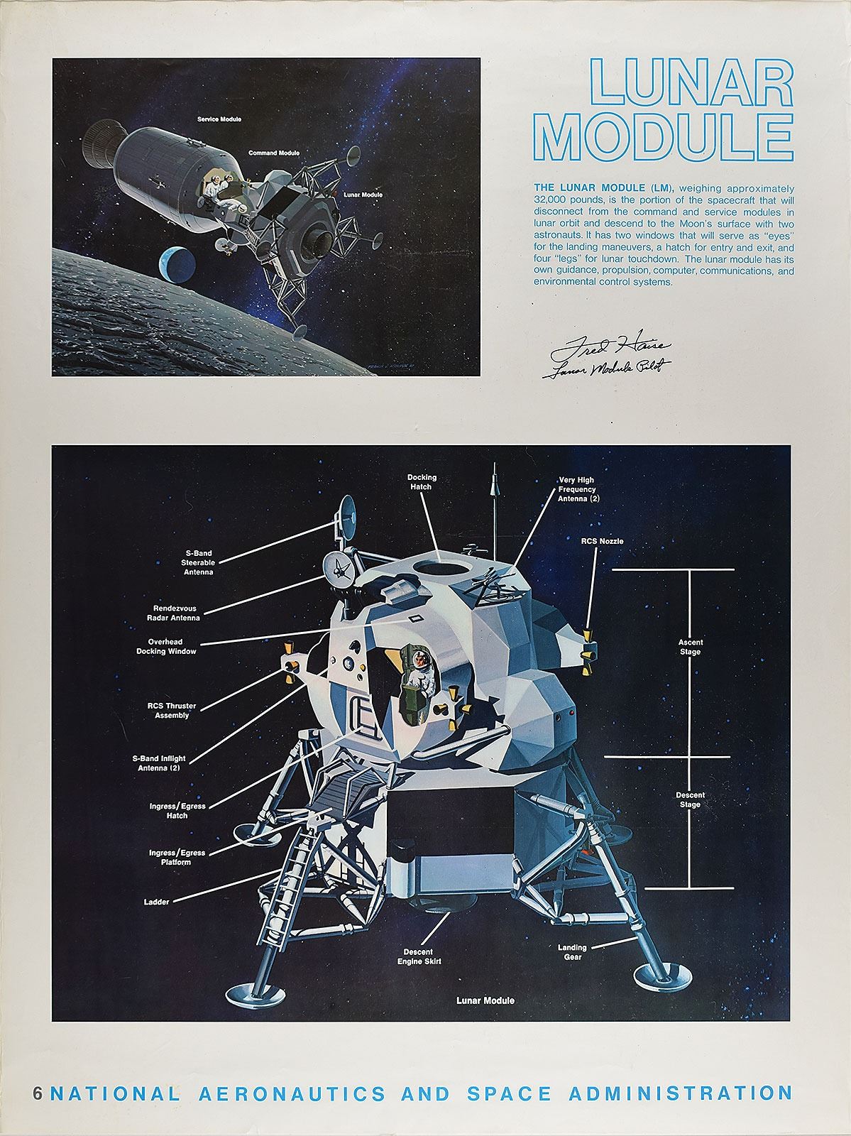 Attractive official color 30 x 40 NASA poster for the Apollo Lunar Module published prior to Apollo 11, signed in black felt tip, "Fred Haise, Lunar Module Pilot." This large and visually appealing poster features two artistic diagrams of the Lunar Module, both with identifying markers, and a detailed information paragraph to upper left. Rolled and in fine condition, with creasing to the top corners, and a few short edge tears.
