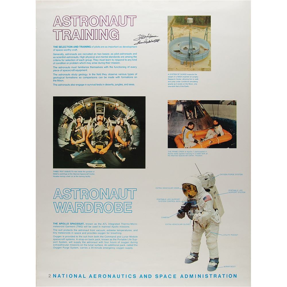 Official color 30 x 40 NASA informational poster with descriptions of astronaut training and the A7L space suit, signed in black felt tip, "Fred Haise, Lunar Module Pilot." In fine condition, with creasing to the top margin.