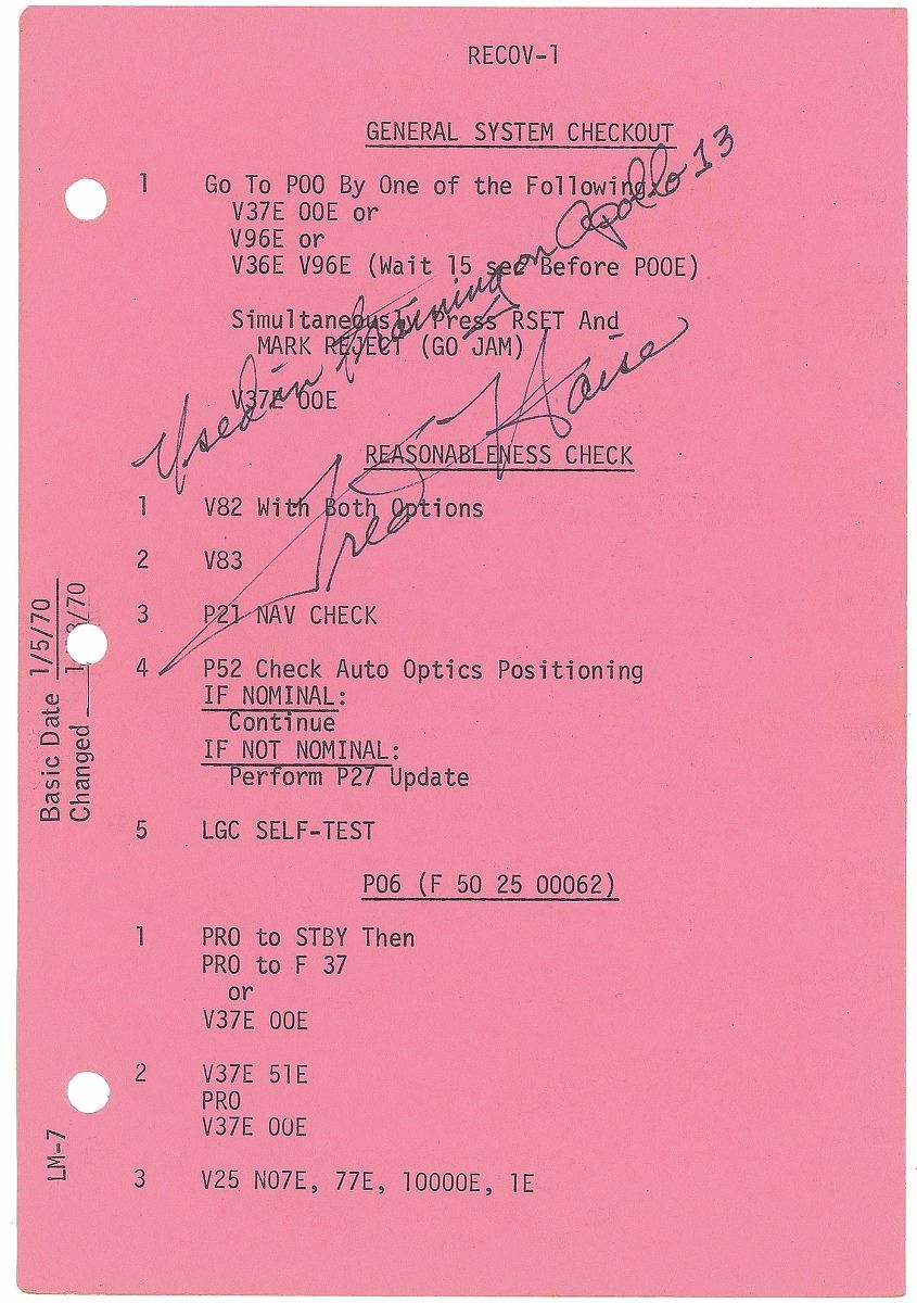 Double-sided page removed from the Apollo 13 Lunar Module Flight Crew G & N Dictionary, 5.5 x 8, listing various steps for “Recov–1” and “Recov–2,” with basic and revision dates of January 5 and 18, 1970, signed on one side in black felt tip, “Used in training for Apollo 13, Fred Haise.” In fine condition.