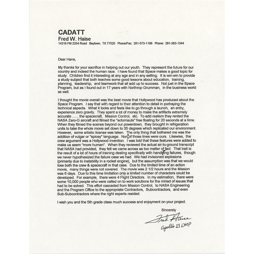 TLS, one page, 8.5 x 11, personal letterhead, no date. Letter to a teacher, in part: "Many thanks for your sacrifice in helping out our youth. They represent the future for out country and indeed the human race. I have found that Space makes a good topic for study. Children find it interesting at any age and in any setting. It is win-win to provide a study subject that both teaches some good lessons about education, training, planning, leadership, and teamwork that all add up to success. Not just in the Space Program, but as I found out in 17 years with Northrop Grumman, in the business world as well. I thought the movie was the best movie that Hollywood has produced about the Space Program. I say that with regard to their attention to detail in portraying the technical aspects. What it looks like and feels like to go through a launch, an entry, experience zero gravity. They spent a lot of money to make the artifacts extremely accurate… the spacecraft, Mission Control, etc. To add realism they rented the NASA Zero-G aircraft and filmed the 'actornauts' free floating for 20 seconds at a time. When they filmed the scenes beyond our powerdown, they brought in refrigeration units to take the whole movie set down to 35 degrees which replicated our environment. However, some artistic license was taken. The only thing that bothered me was the addition of vulgar or 'spicey' language. None of those lines were ours." In fine condition.