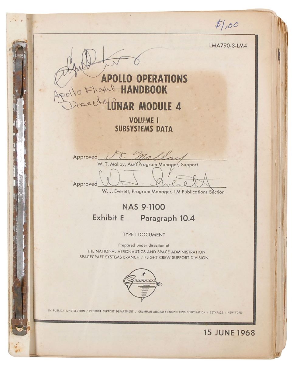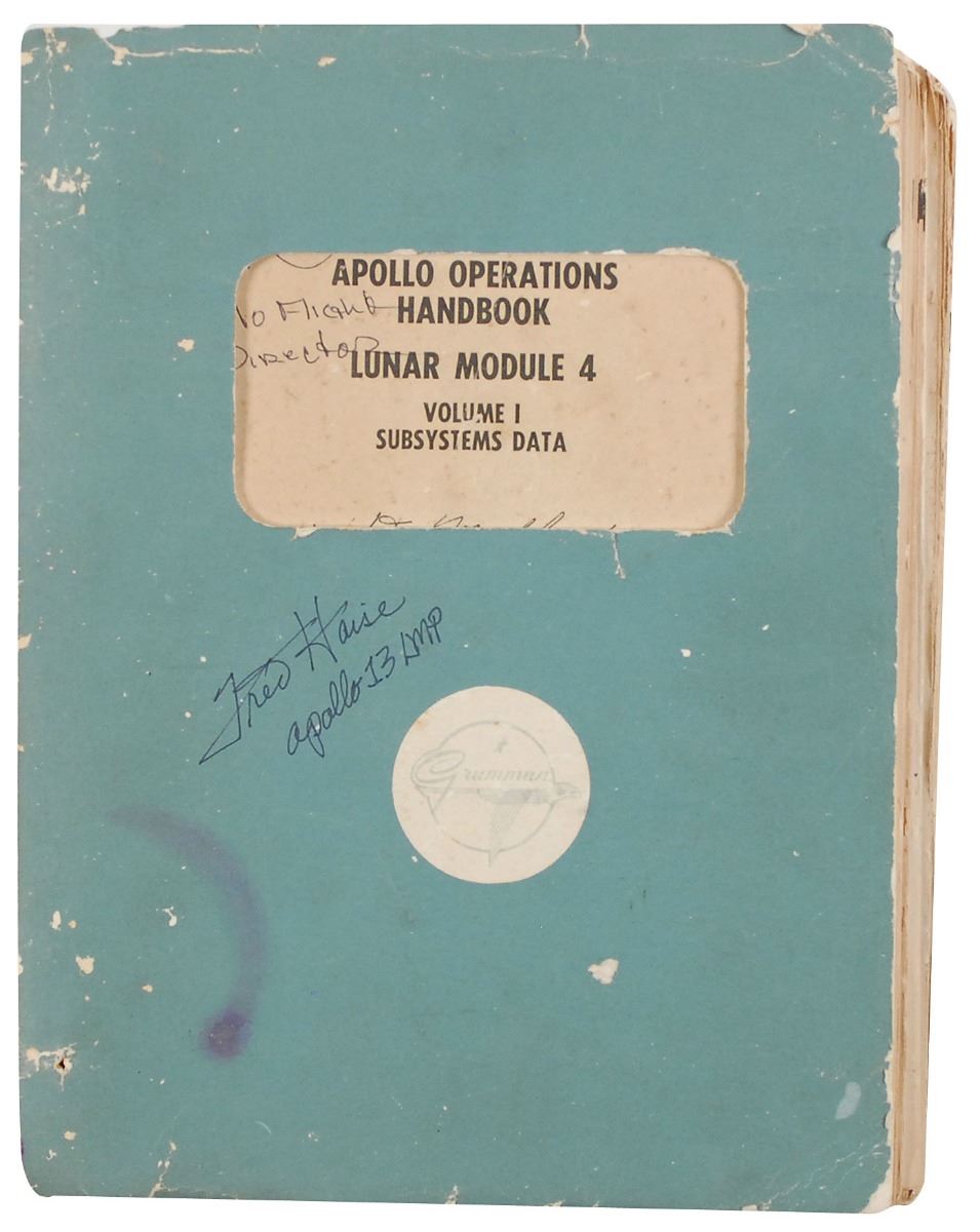 Large printed Apollo Operations Handbook for Lunar Module 4, Volume I, Subsystems Data, published by Grumman, 8 x 11, dated June 15, 1968, signed on the front cover in black felt tip, “Fred Haise, Apollo 13 LMP,” and on the title page in black felt tip, “Eugene Kranz, Apollo Flight Director.” Handbook consists of several hundred pages providing extremely thorough procedures, descriptions, and several detailed pull-out schematics and diagrams. In good to very good condition, with heavy overall wear from use and small tears to many binding holes.