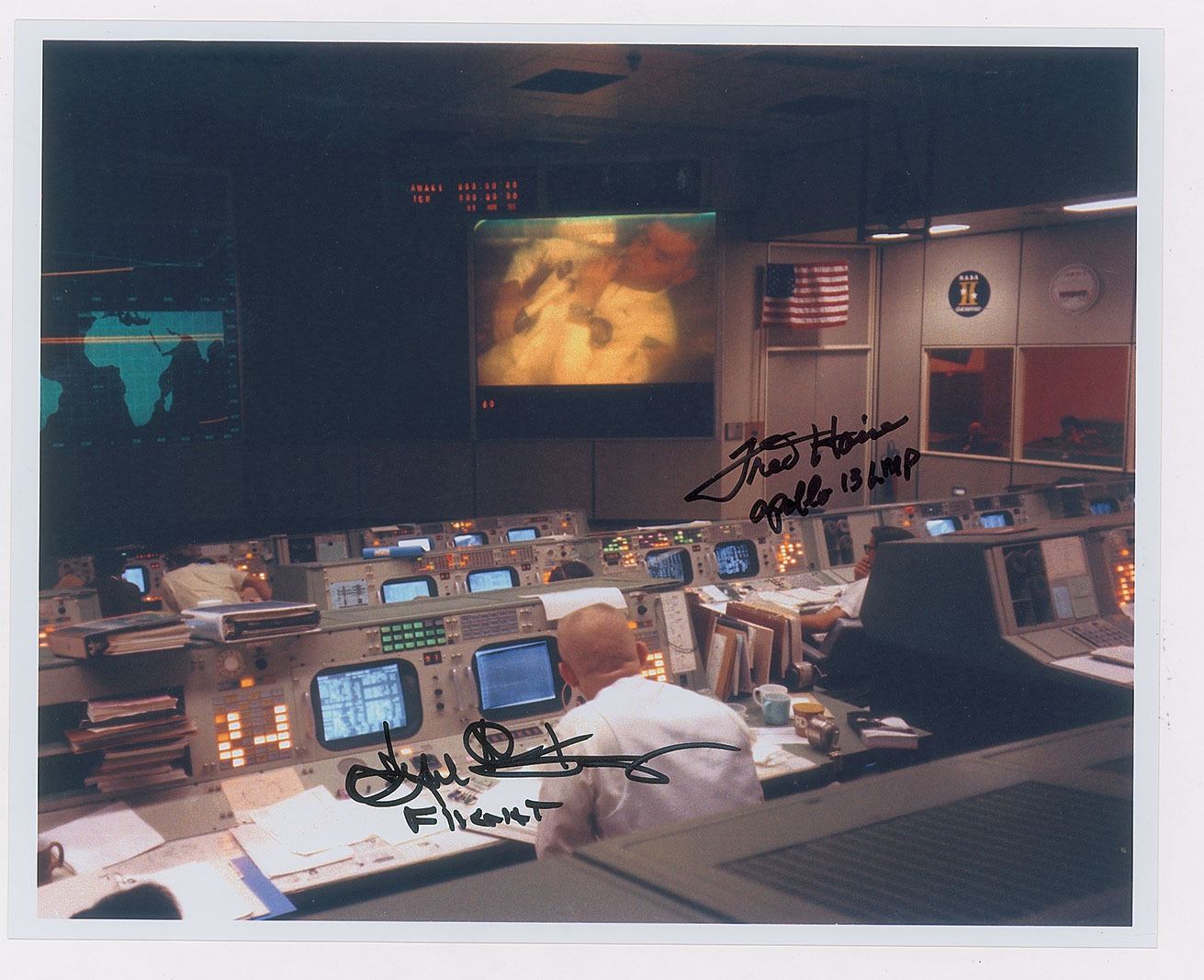Seldom-seen color satin-finish 10 x 8 photo of the mission control room, showing Gene Kranz watching astronaut Fred Haise on a large overhead screen, signed in black felt tip by both, with Kranz adding "Flight" and Haise adding "Apollo 13 LMP." In fine condition, with a few light surface creases.