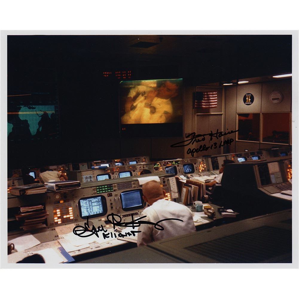 Color satin-finish 10 x 8 photo of Gene Kranz watching an image of Fred Haise on a large screen at mission control, signed in black felt tip, "Fred Haise, Apollo 13 LMP" and "Eugene F. Kranz, Flight." In very fine condition.