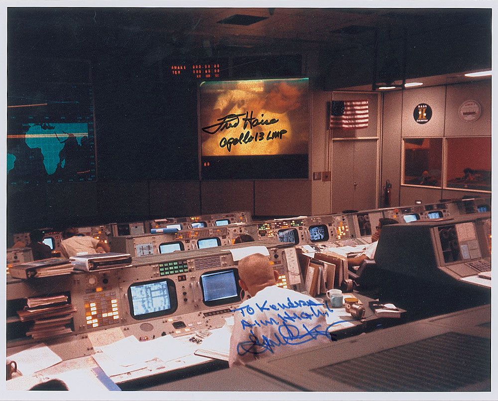 Color satin-finish 10 x 8 photo of Kranz watching an image of Fred Haise on a large screen at mission control, signed in black felt tip, “Fred Haise, Apollo 13 LMP,” and signed and inscribed in blue felt tip, “To Kendra, Aim High! Gene Kranz.” In fine condition.