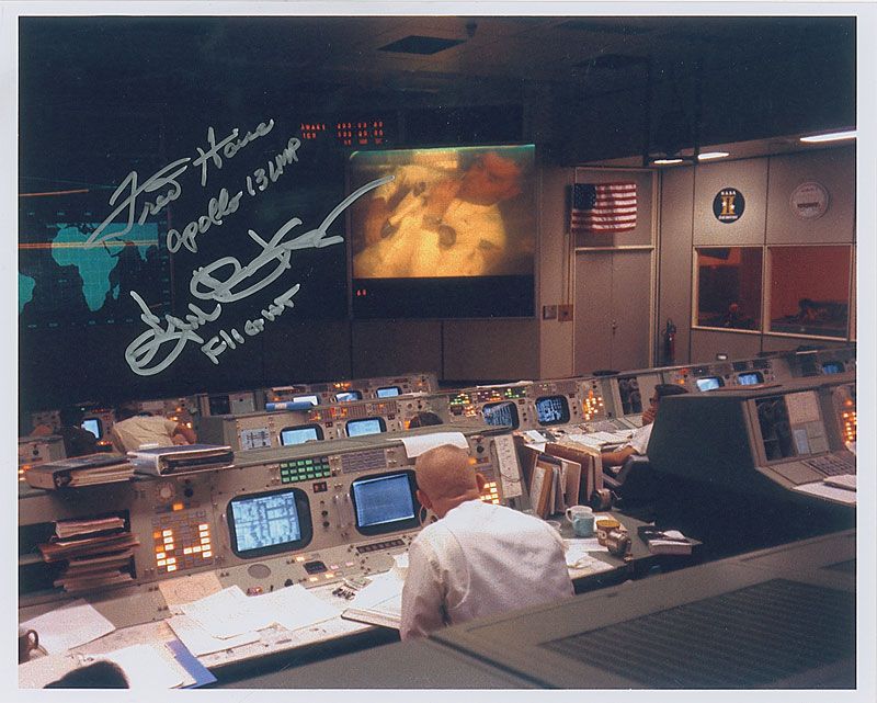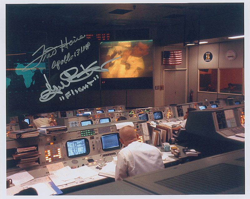 Two identical color satin-finish 10 x 8 photos of Kranz watching an image of Fred Haise on a large screen at mission control, signed in silver ink, “Fred Haise, Apollo 13 LMP,” and “Gene Kranz, ‘Flight.’” In fine condition.