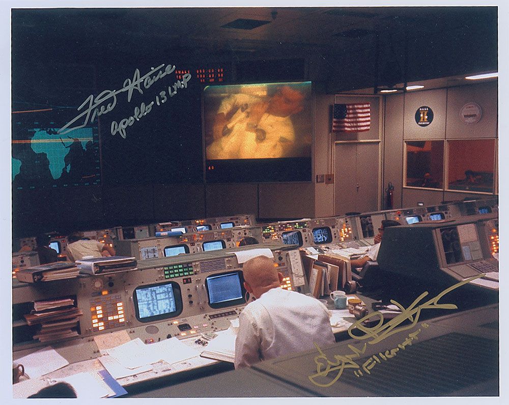Color satin-finish 10 x 8 photo of Kranz watching an image of Fred Haise on a large screen at mission control, signed in silver ink, “Fred Haise, Apollo 13 LMP,” and in gold ink, “Gene Kranz, ‘Flight.’” In fine condition.