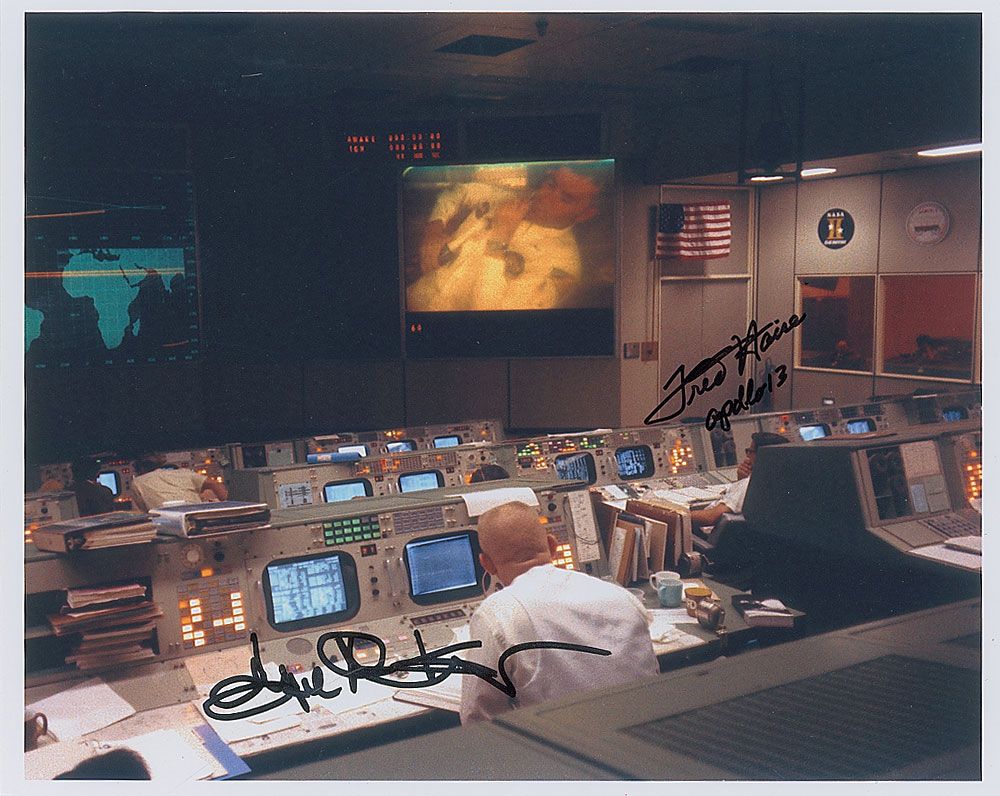 Color satin-finish 10 x 8 photo of Kranz watching an image of Fred Haise on a large screen at mission control, signed in black felt tip by Kranz and Haise, who adds, “Apollo 13.” In very fine condition.