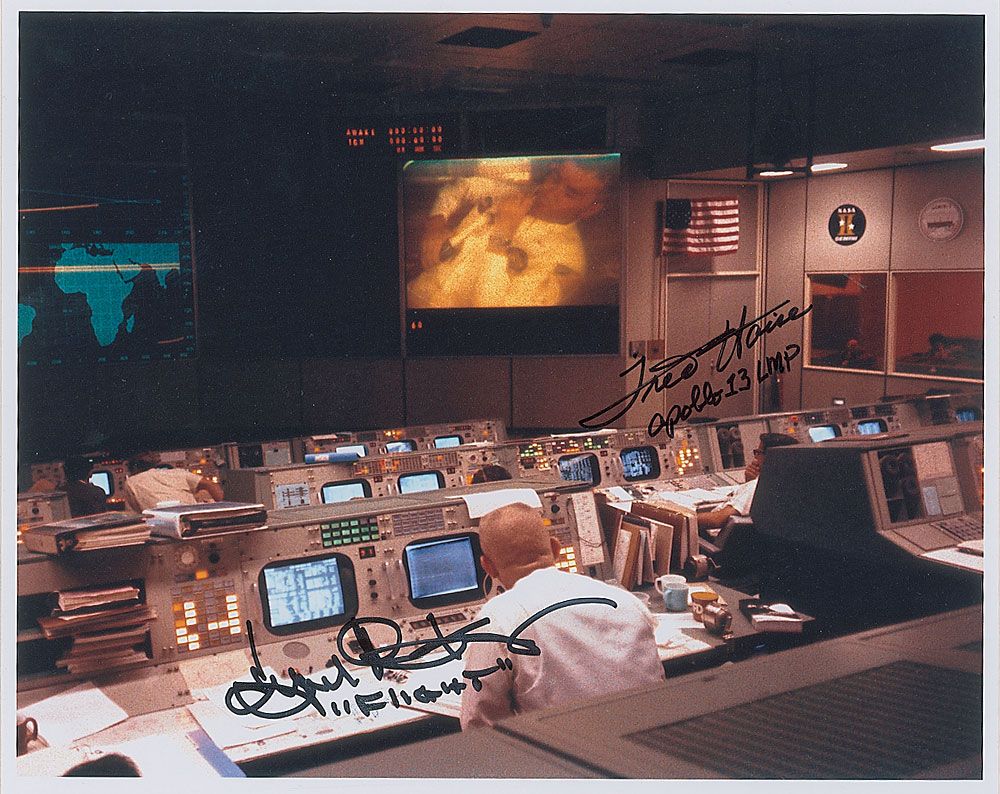 Color satin-finish 10 x 8 photo of Kranz watching an image of Fred Haise on a large screen at mission control, signed in black felt tip, “Fred Haise, Apollo 13 LMP” and “Gene Kranz ‘Flight.’” In fine condition.