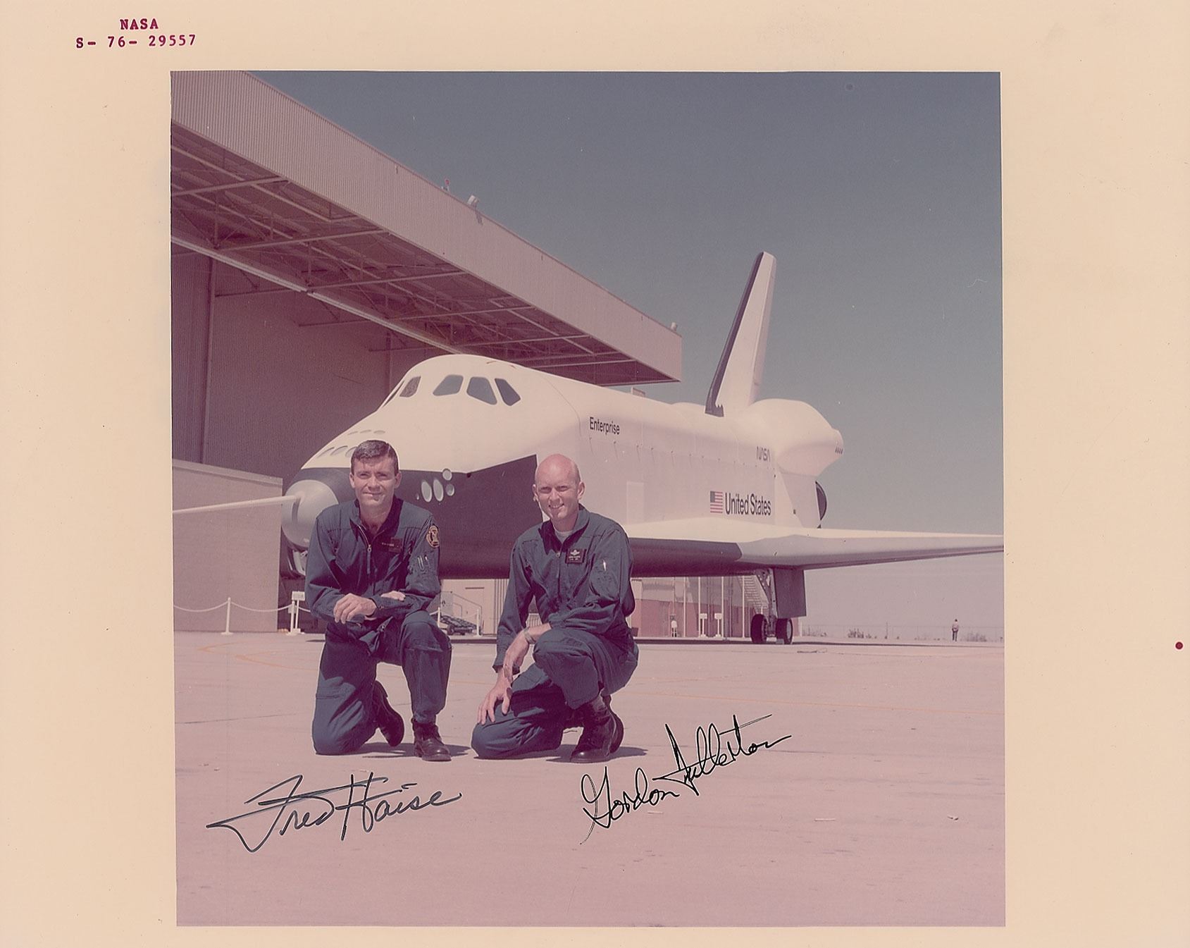 Official color semi-glossy 10 x 8 red-numbered NASA photo of the first Approach and Landing Tests crew kneeling in front of the Enterprise orbiter, signed in black ink by Fred Haise and Gordon Fullerton. Reverse bears faded purple NASA caption text and "This Paper Manufactured by Kodak" watermarks. In very fine condition.