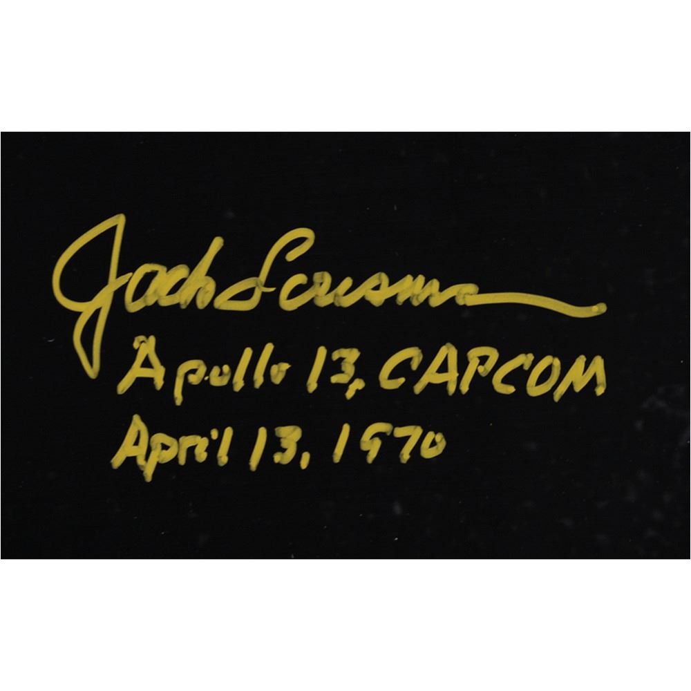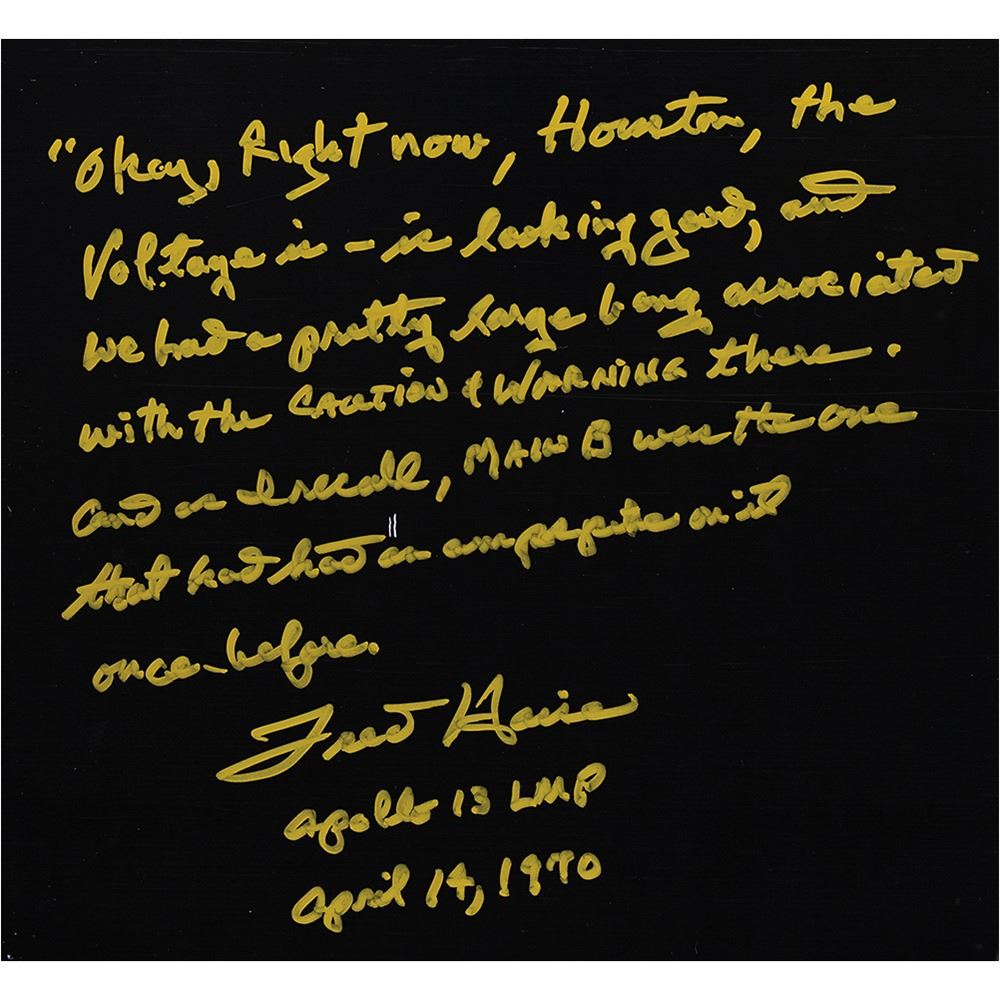 Huge glossy 29.5 x 23 photo of the damaged Apollo 13 service module floating in space after jettison from the command module, signed in gold ink, ‰ÛÏFred Haise, Apollo 13 LMP, April 14, 1970‰Û and ‰ÛÏJack Lousma, Apollo 13 CAPCOM, April 14, 1970.‰Û Haise adds his portion of the conversation following the service module explosion: ‰ÛÏOkay. Right now, Houston, the voltage is‰ÛÓis looking good, and we had a pretty large bang associated with the CAUTION & WARNING there. And as I recall, MAIN B was the one that had had an amp spike on it once before!‰Û Lousma adds notes on his role and a longer section of the back-and-forth between crew and mission control: ‰ÛÏI was the Capcom at MCC in the ‰Û÷White Team‰Ûª when Apollo 13 was about 210,000 miles from Earth when the accident happened on April 13, 1970. 55 hours, 54 minutes, 53 seconds‰ÛÓOxygen Tank #2 exploded in the service module (SM).‰ÛÓJack Swigert, CMP: ‰Û÷Okay, Houston, we`ve had a problem here.‰Ûª‰ÛÓJack Lousma, Capcom: ‰Û÷This is Houston. Say again, please.‰Ûª‰ÛÓJim Lovell, CDR: ‰Û÷Ah, Houston, we`ve had a problem. We‰Ûªve had a Main Bus B undervolt.‰Ûª‰ÛÓJack Lousma, Capcom: ‰Û÷Roger, Main Bus B undervolt.‰Ûª‰Û In fine condition, with apparent scuffs and wear inherent to the original image and not the photo.