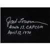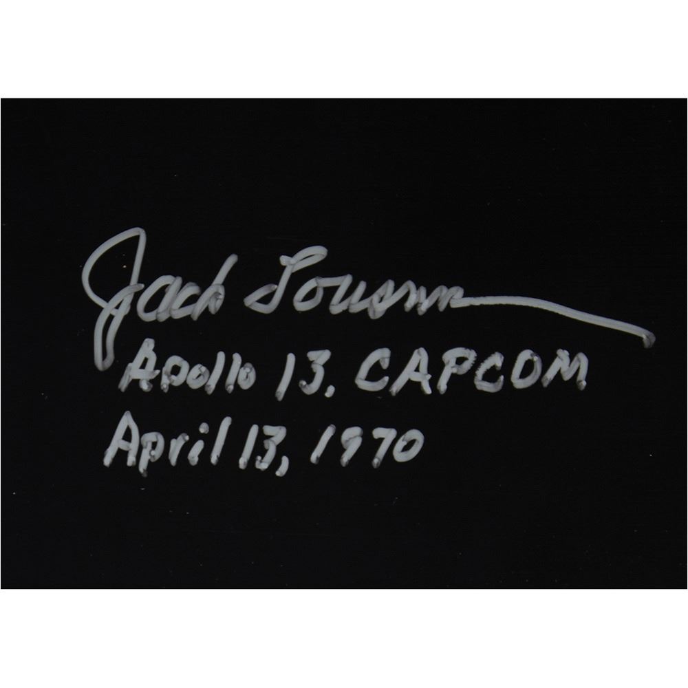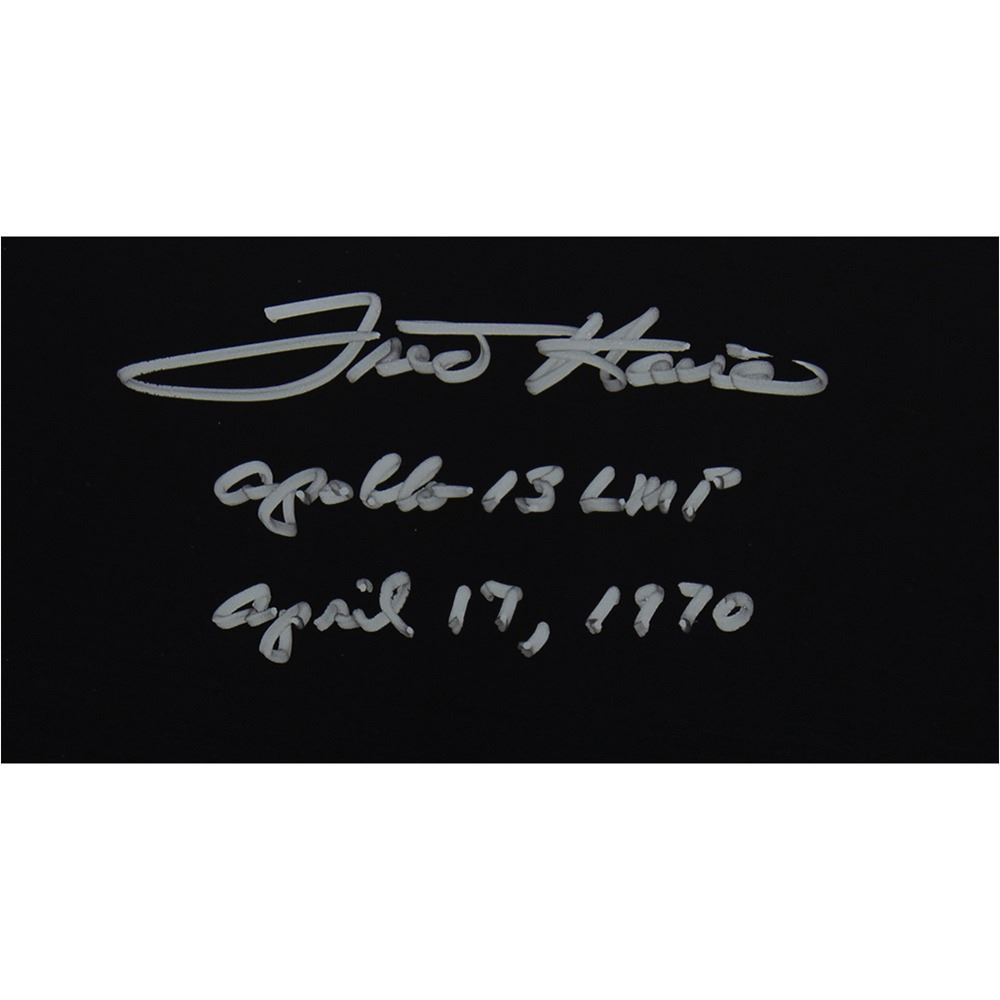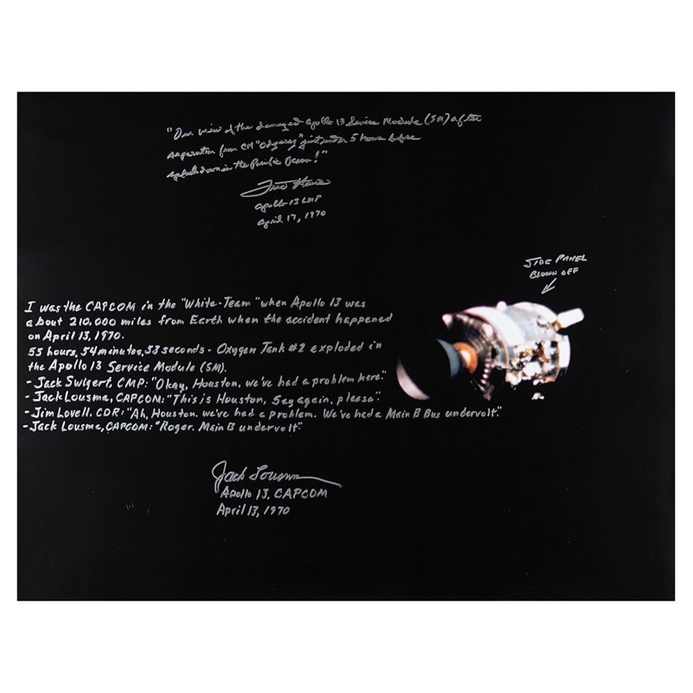 Large glossy 30 x 23 photo of the damaged Apollo 13 service module floating in space after jettison from the command module, signed in silver ink, ‰ÛÏOur view of the damaged Apollo 13 Service Module (SM) after separation from CM ‰Û÷Odyssey‰Ûª just under 5 hours before splashdown in the Pacific Ocean!‰Ûª Fred Haise, Apollo 13 LMP, April 17, 1970,‰Û who draws an arrow to the capsule and writes ‰ÛÏSide panel blown off,‰Û and ‰ÛÏJack Lousma, Apollo 13 CAPCOM, April 13, 1970,‰Û who adds notes about his role and then the conversation after the explosion: ‰ÛÏI was the Capcom at MCC in the ‰Û÷White Team‰Ûª when Apollo 13 was about 210,000 miles from Earth when the accident happened on April 13, 1970. 55 hours, 54 minutes, 53 seconds‰ÛÓOxygen tank #2 exploded in the service module (SM).‰ÛÓJack Swigert, CMP: ‰Û÷Okay, Houston, we`ve had a problem here.‰Ûª‰ÛÓJack Lousma, Capcom: ‰Û÷This is Houston. Say again, please.‰Ûª‰ÛÓJim Lovell, CDR: ‰Û÷Ah, Houston, we`ve had a problem. We`ve had a Main Bus B undervolt.‰Ûª‰ÛÓJack Lousma, Capcom: ‰Û÷Roger, Main Bus B undervolt.‰Ûª‰Û In fine condition, with a few small creases (other apparent scuffs and wear are inherent to the original image and not the photo).