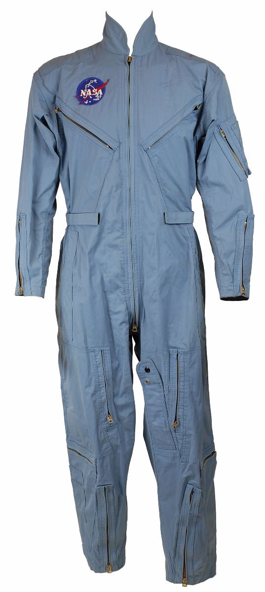Blue Apollo-era NASA flight suit given to a high school friend of Haise’s son, with an official NASA ‘meatball’ logo patch on the right breast. The original Land Mfg. Co. Flite Wear tag is sewn into the collar area, with a size of “40, Short” indicated on a small white tag below. Also includes an 18 x 14 print of an illustrated portrayal of Haise, signed and inscribed to the recipient of the flight suit in black ink, "To John—Thanks for being such a good friend for our son Fred. Best Wishes, Fred W. Haise." The suit is in fine condition, with general wear and a red mark to one shoulder; the print is in very good condition, with an overall block of toning and scattered creases. Accompanied by a letter of provenance from the original recipient, in part: "While attending Clear Lake High School from 1972–1976 I became good friends with Fred T. Haise. I went to Fred's house in El Lago, Texas quite often after school as our friendship grew…I found out his dad was Fred Haise Jr., the astronaut from Apollo 13…I actually got to go see Fred's dad train in the flight simulator at NASA as he prepared for the testing of the space shuttle's first flight off of NASA's 747 jet...Fred T. Haise gave me one of his dad’s training suits that I’ve had now for over 38 years."